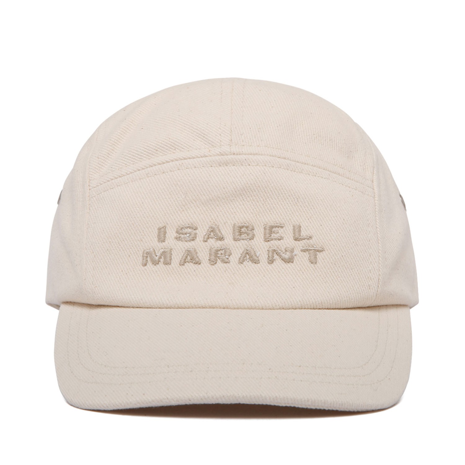 Isabel Marant Ecru Tedji Baseball Cap. Ecru cotton and canvas blend baseball cap with embroidered logo to the front, eyelet vents, flat crown. Slide-buckle fastening and adjustable fit.