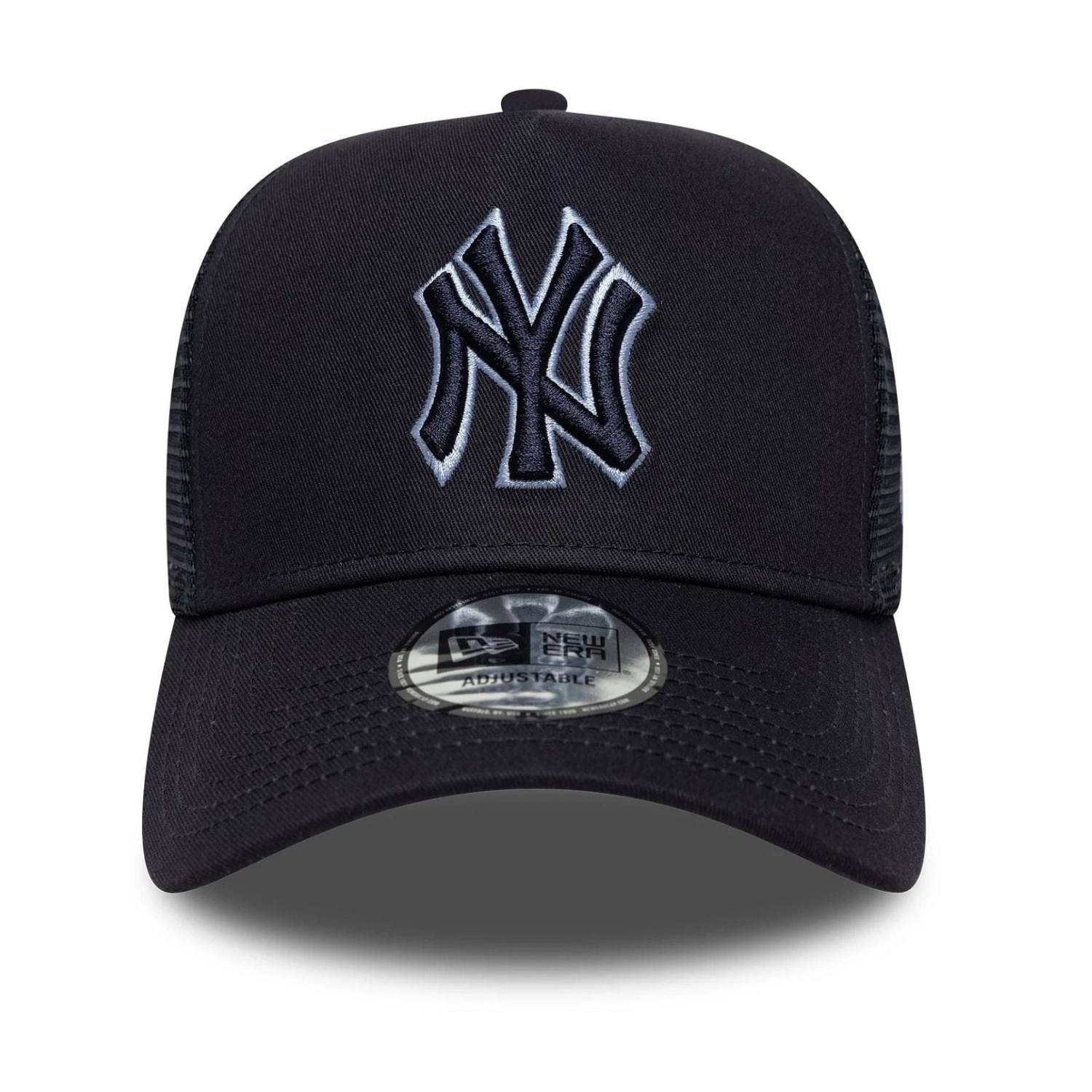 New Era Navy Blue 9FORTY E-Frame Trucker New York Yankees MLB Outline. Navy blue 9FORTY E-Frame Trucker New York Yankees MLB Outline with New York Yankees logo on the front, New Era Flag embroidered on the left. Structured E-Frame crown, adjustable snapback closure, curved visor, from the back and forth in the net.
