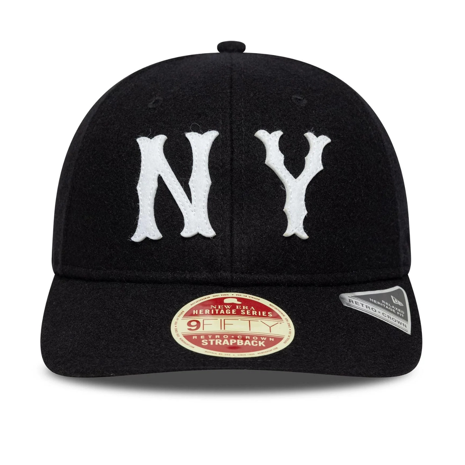 New Era Black 9FIFTY Retro Crown New York Highlanders MLB. Black 9FIFTY Retro Crown New York Highlanders MLB with Cooperstown New York Highlanders logo on the front, New York Highlanders centre field, embroidered New Era flag on the left. Unstructured back crown with adjustable strapback closure, curved visor, green under-visor, made of wool.