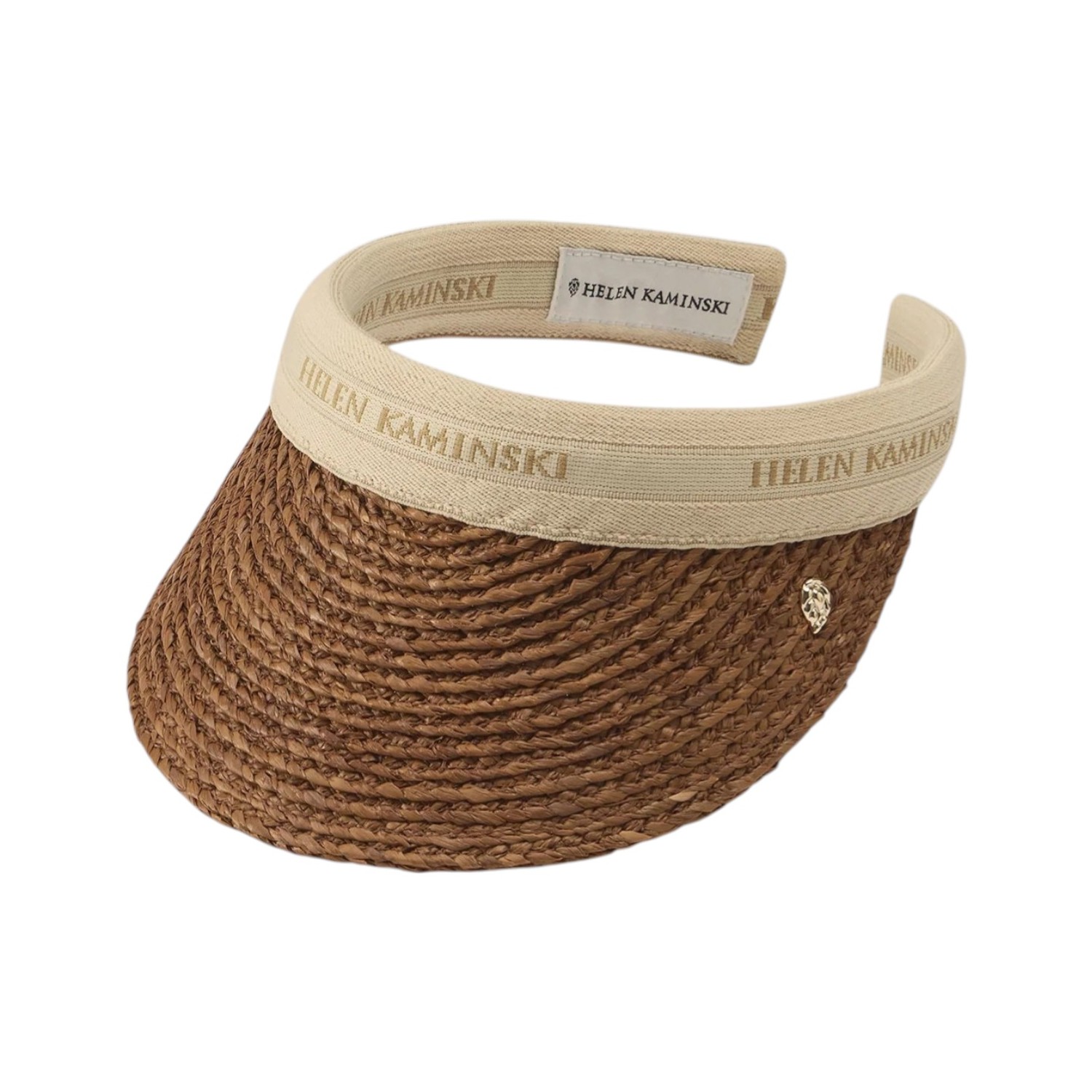 Helen Kaminski Bianca 8 Raffia Logo Visor. Nougat and natural raffia visor defined by effortless summer elegance and artisanal craftsmanship. Handcrafted in woven raffia, the Bianca 8 visor features a wide brim that provides optimal sun protection while maintaining a lightweight, breathable feel. The neutral canvas band is detailed with the Helen Kaminski logo, adding a refined signature touch. Designed with an open crown for comfort and versatility, it ensures a secure and flexible fit. Finished with a subtle metallic logo charm, this timeless accessory is perfect for warm-weather styling, from beach days to elevated resort looks.