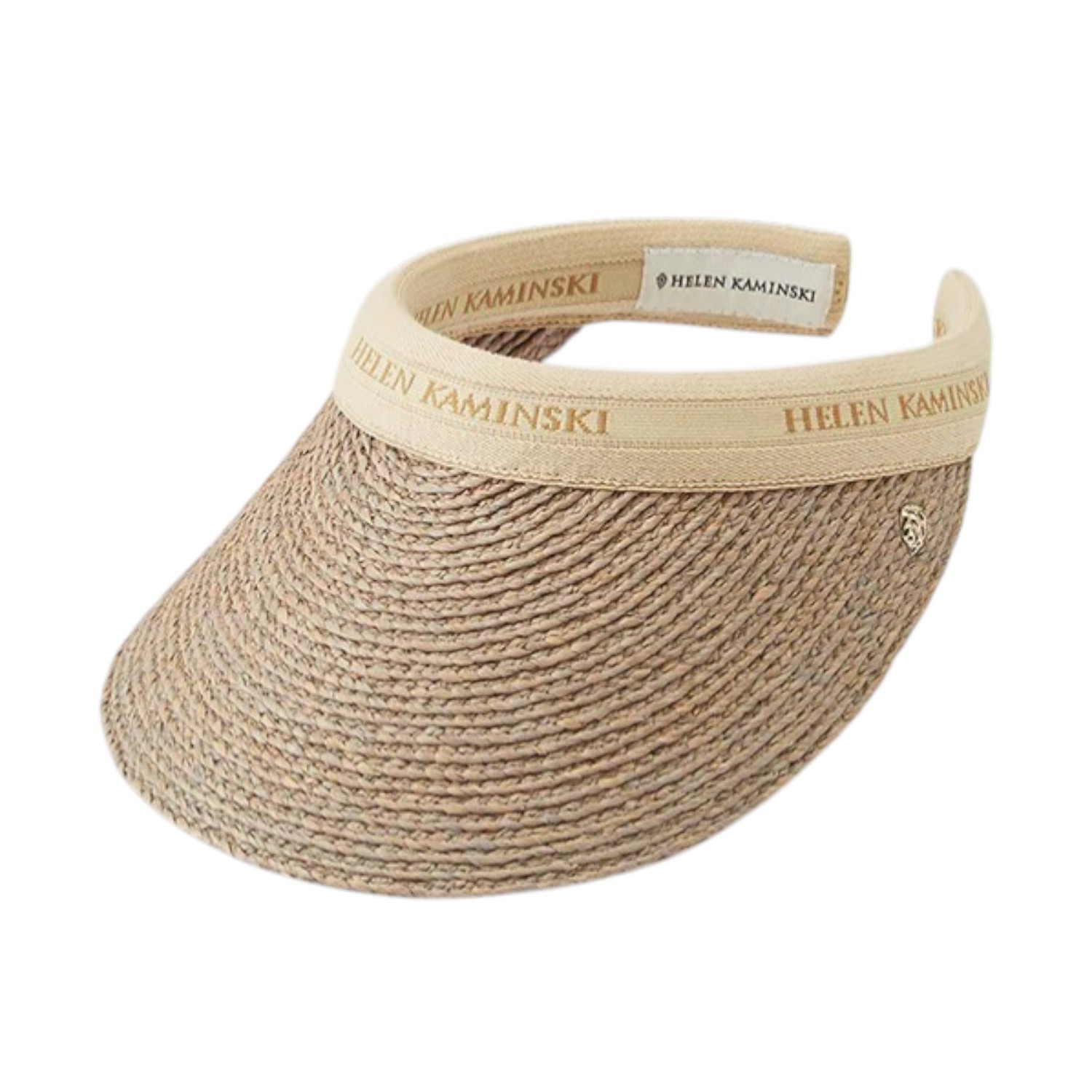 Helen Kaminski Bianca 8 Raffia Logo Visor. Eclipse melange raffia visor defined by effortless summer elegance and artisanal craftsmanship. Handcrafted in woven raffia, the Bianca 8 visor features a wide brim that provides optimal sun protection while maintaining a lightweight, breathable feel. The neutral canvas band is detailed with the Helen Kaminski logo, adding a refined signature touch. Designed with an open crown for comfort and versatility, it ensures a secure and flexible fit. Finished with a subtle metallic logo charm, this timeless accessory is perfect for warm-weather styling, from beach days to elevated resort looks.