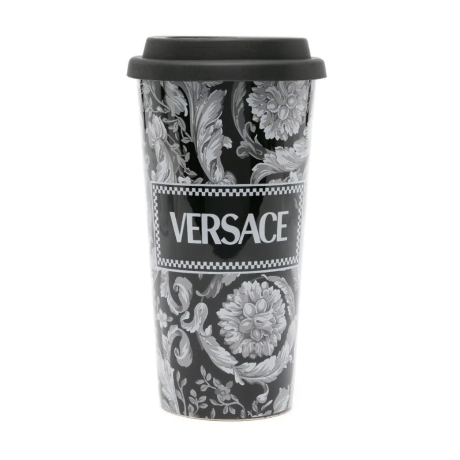 Versace Home Black Barocco-Print Ceramic Travel Mug. Black ceramic travel mug with signature Barocco print, logo print to the front, cylinder body and rubber lid.