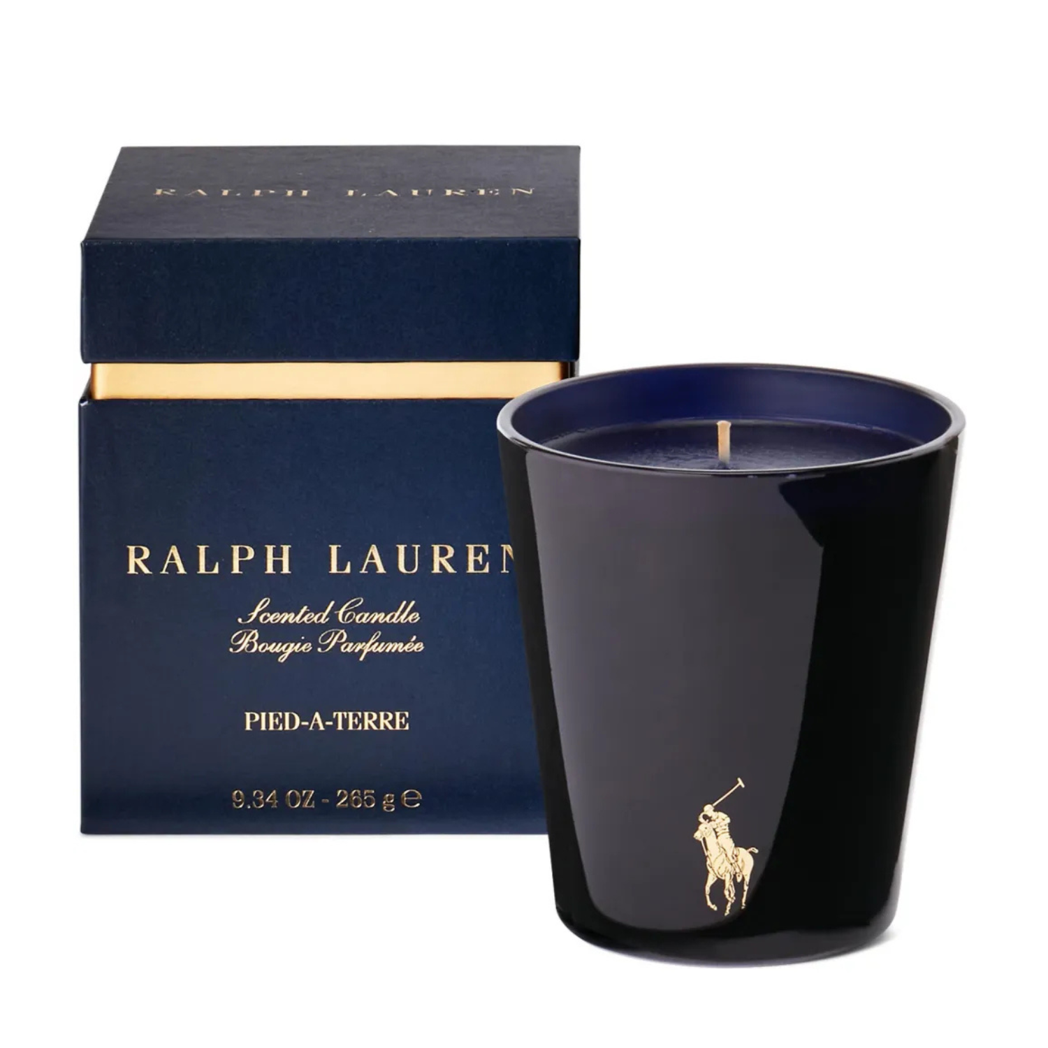 Ralph Lauren Home Pied a Terre Candle. Navy blue and gold-tone candle with soy wax, signature Polo Pony motif, single cotton wick, circular design, matching lid.