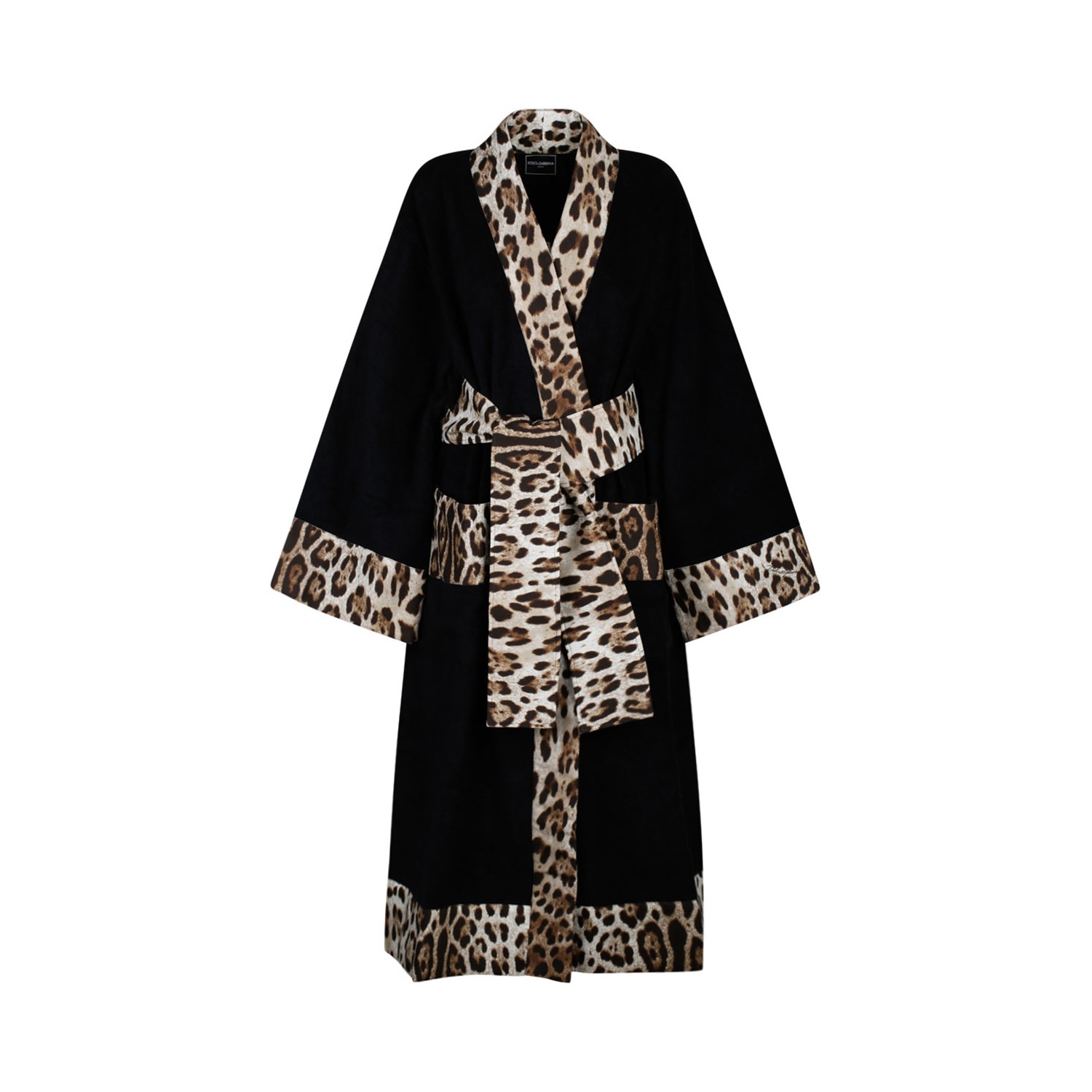 Dolce & Gabbana Leopard Print Trim Bathrobe. Black, brown and beige cotton bathrobe, leopard print pattern, belted waist, two front patch pockets.