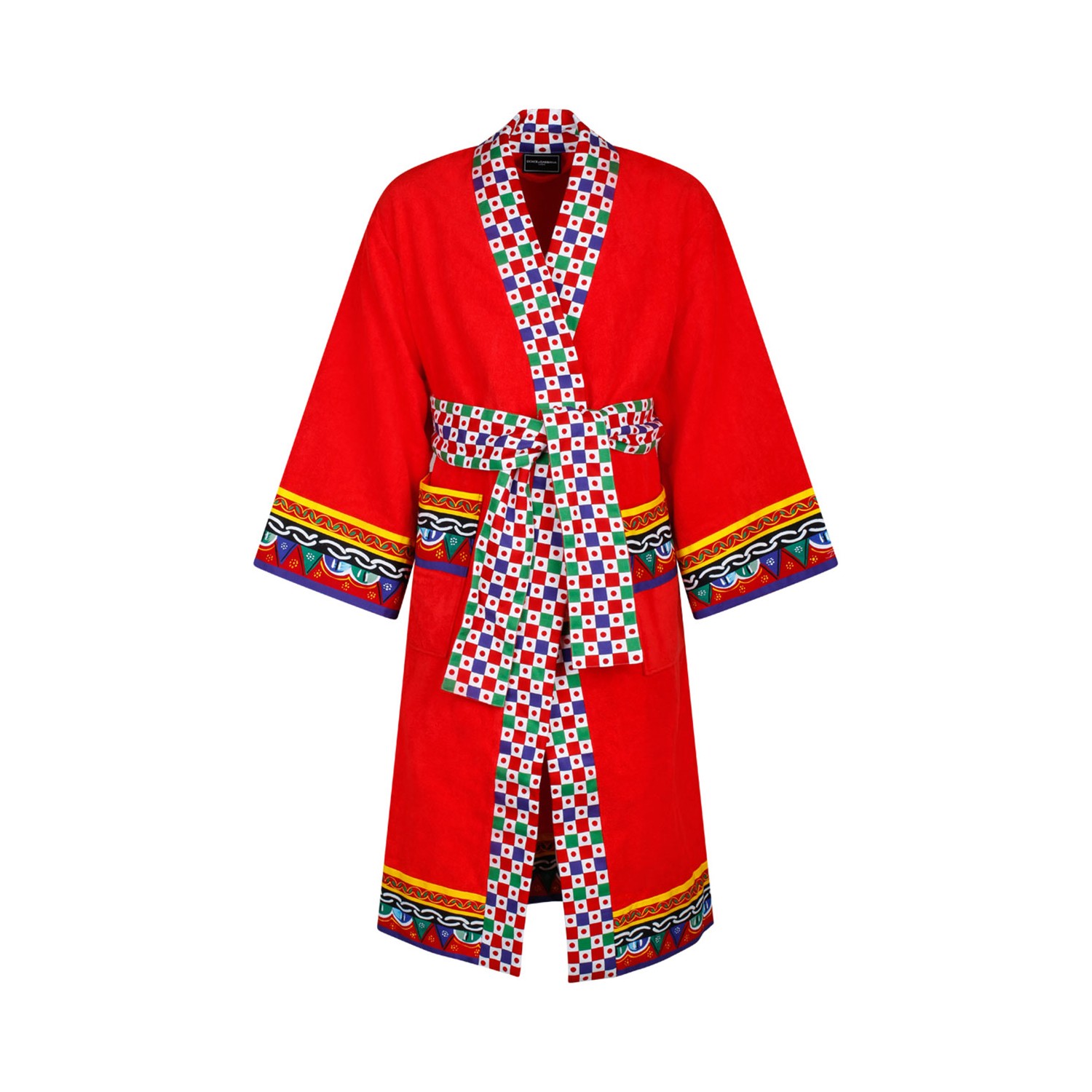 Dolce & Gabbana Carretto Sciliano Printed Trim Bathrobe. Red and multicolour cotton bathrobe, terry cloth effect, folklore inspired Carretto Siciliano design, towelling finish, long sleeves, adjustable waist strap.