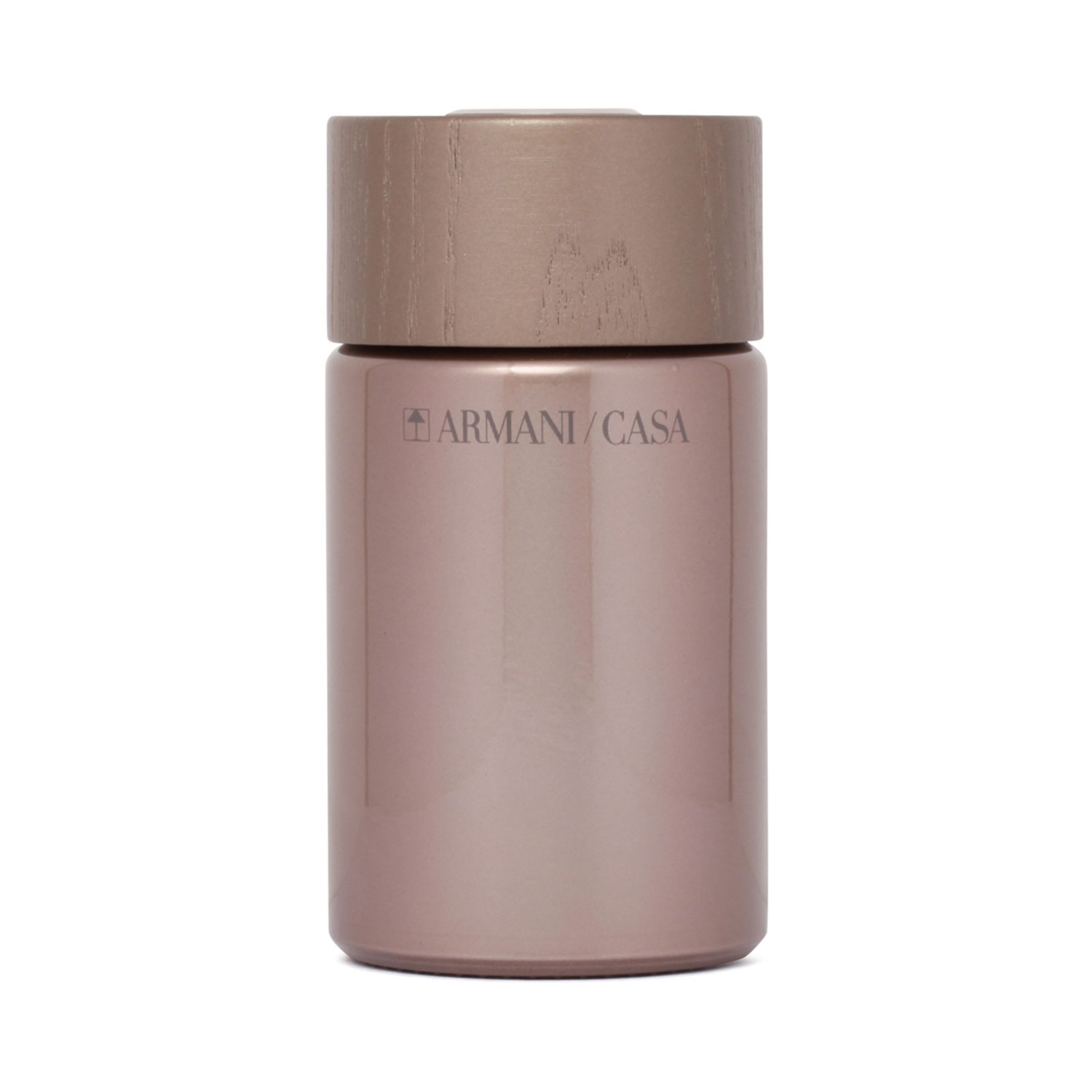 Armani Casa Wardrobe Fragrance. Wardrobe fregance has an elegant, minimalist design typical of the brand's style. The bottle is cylindrical, with a matte metal finish in a powder pink or light bronze shade. The surface of the bottle is engraved with the Armani/Casa logo, confirming that it belongs to the luxury home product line.
