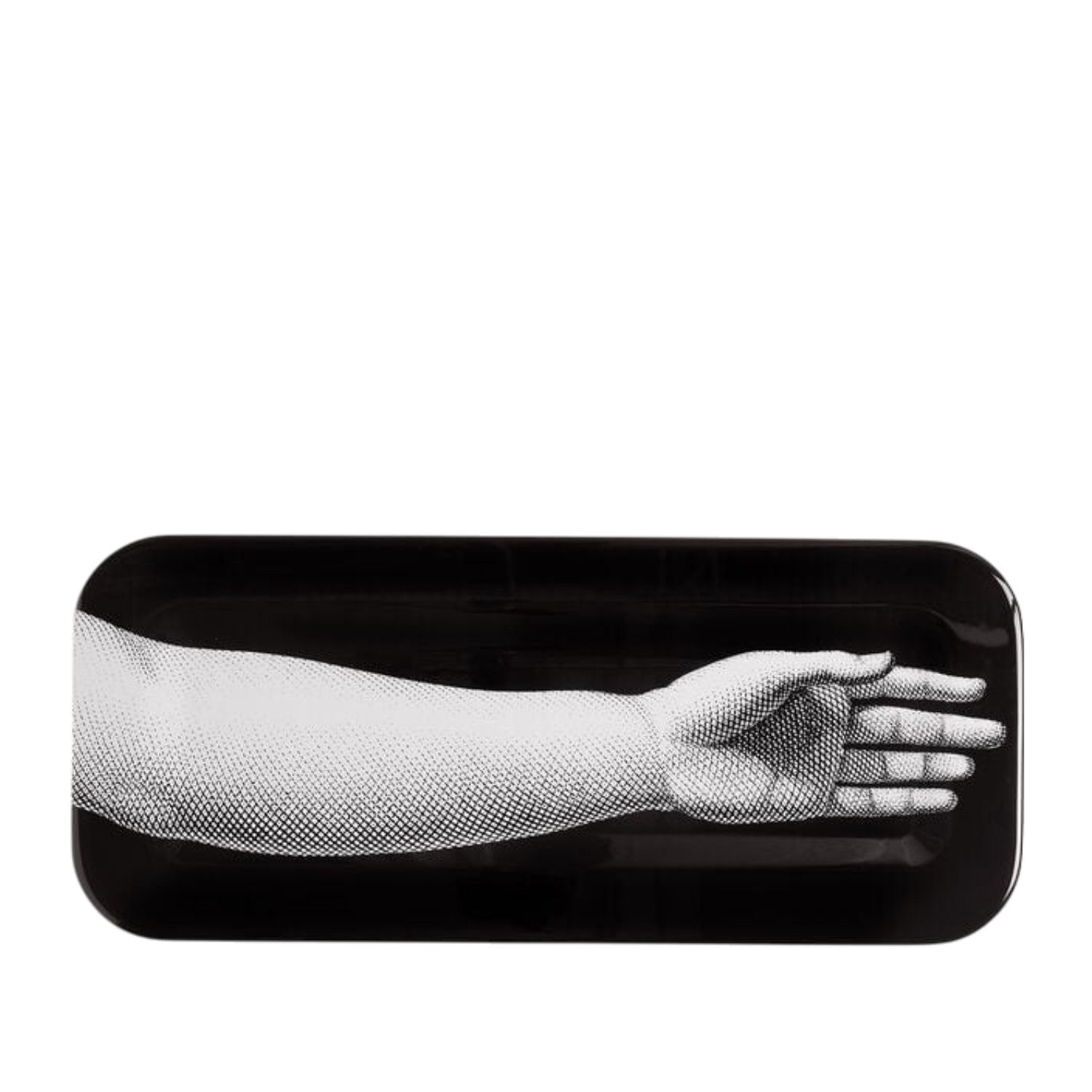 Fornasetti Hand Tray. The tray, with its shape similar to a sheet of paper, is the complement that best lends itself to hosting the Atelier decorations. This creation, decorated by hand, is embellished with an anatomical design much loved by Fornasetti. Combined with a pliant structure, the tray can be transformed into a coffee table.Any minimal discrepancies between similar creations are the result of the artisanal production and attest to the uniqueness of each product.