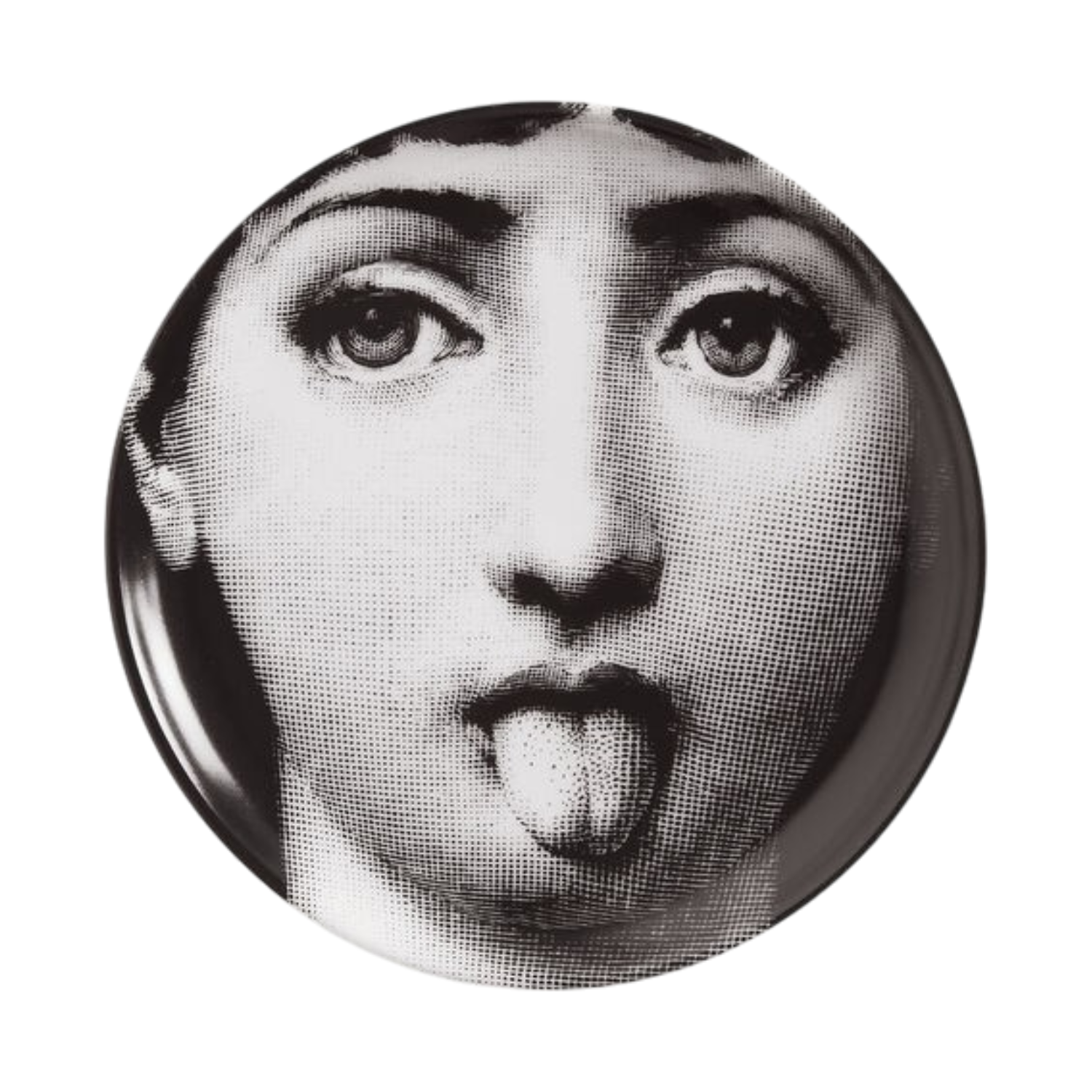 Fornasetti Coaster Theme and Variations n.82. The round shape of this coaster frames the features of Lina Cavalieri, in one of the countless interpretations that Fornasetti dedicated to her in the Tema e Variazioni series. Any minimal discrepancies between similar creations are the result of artisanal production and attest to the uniqueness of each product.