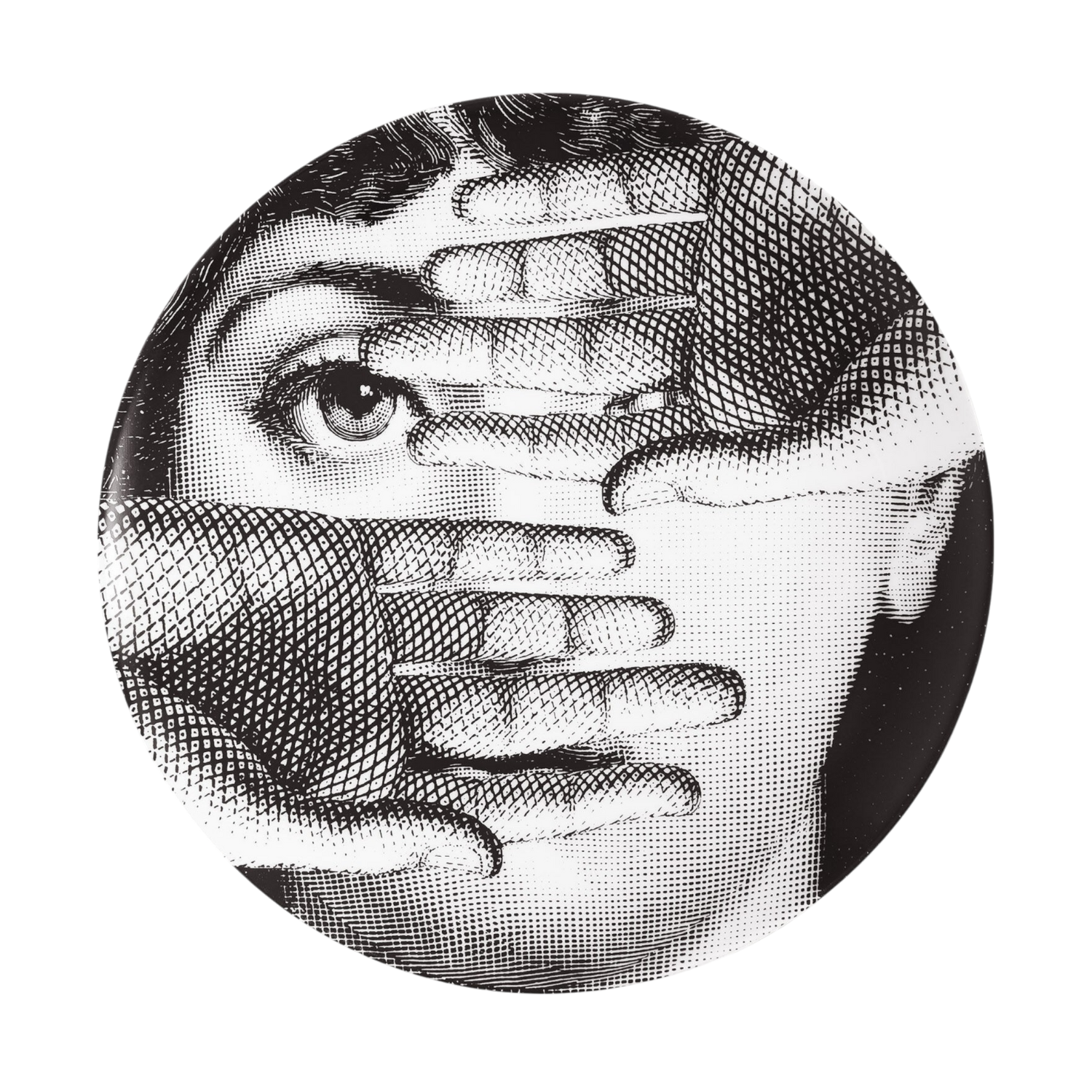 Fornasetti Wall Plate Tema e Variazioni n.154. The face of the opera singer Lina Cavalieri, star of countless reinterpretations by Piero Fornasetti, embellishes this decorative porcelain wall plate from the iconic "Tema e Variazioni" series: a true collector's piece, which lends itself to being exhibited either alone or in creative compositions with the other plates in the series. This hand decorated porcelain plate can be used ornamentally as a centrepiece, or as a wall decoration, thanks to the two holes in the back. For cleaning, we recommend using a microfibre cloth and a neutral or mild detergent.