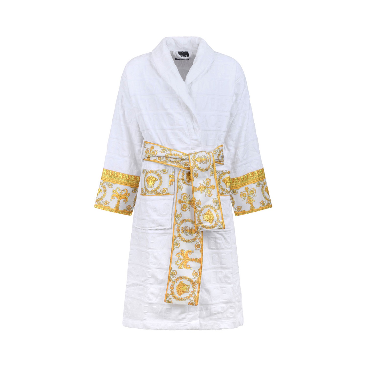 Versace White I Love Baroque Bathrobe. White soft terry bathrobe with tone-on-tone Versace Allover logo print, belt and sleeve with Barocco print.