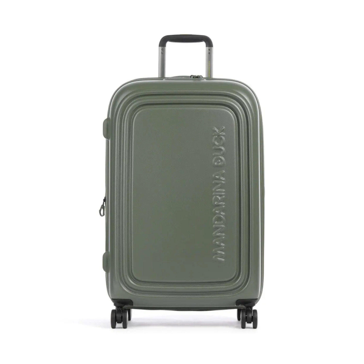 Mandarina Duck Pine Green Logoduck Medium Expandable Trolley. Pine green soft, rounded shapes and a compact volume trolley with two rods, extractable and multi-step. Double interior compartment, 1 zip pocket, adjustable straps with buckle.