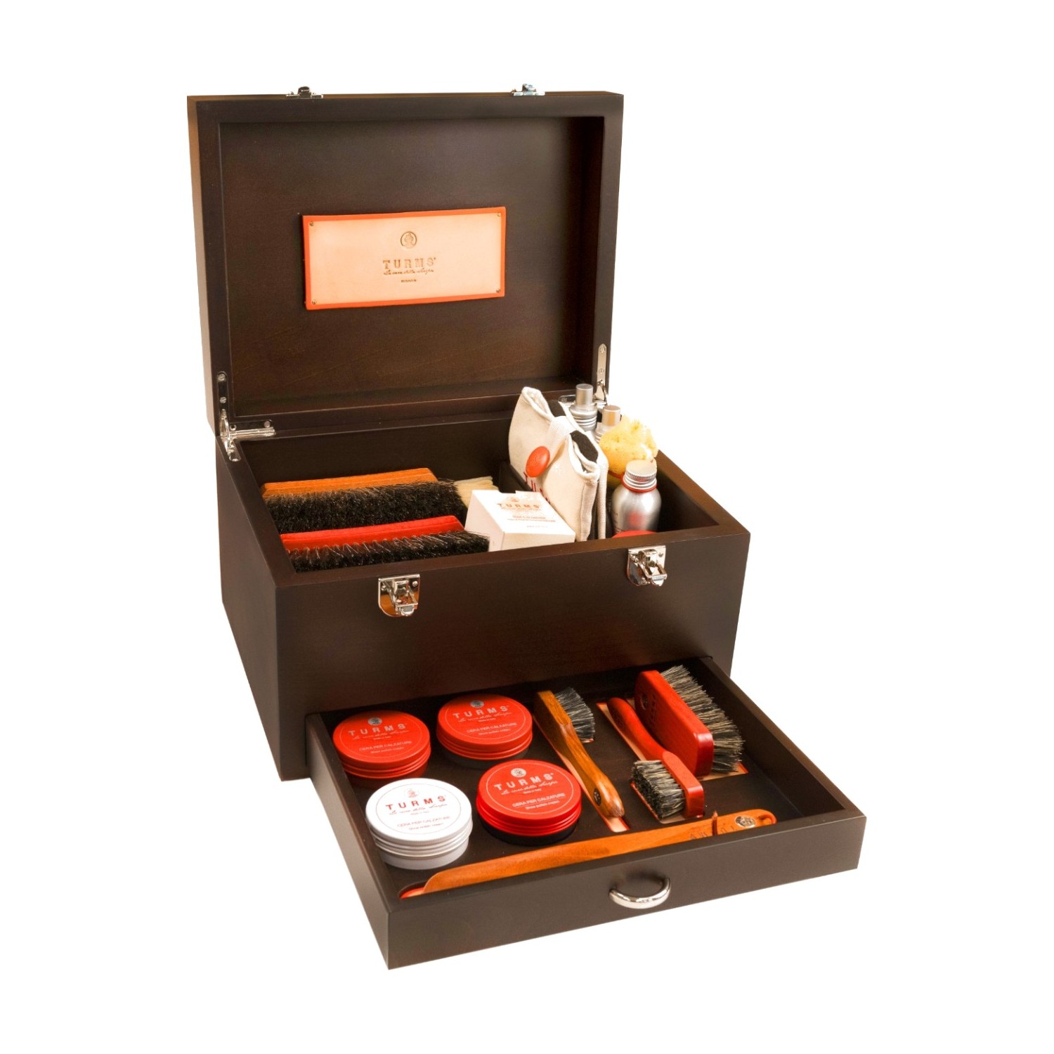 Turms Dark Brown Wooden Case. The box contains: four 75ml tins of black, dark brown, medium brown, and neutral shoe polish, one polishing glove, one wooden shoe horn, two large soft-bristle brushes, one large hard-bristle brush. One medium hard-bristle brush, one rubber shoe brush, two small polishing brushes, one lavender flower set, one shoe deodoriser. One suede protector and shampoo, one natural sea sponge, a 100ml multipurpose cleaning cream.