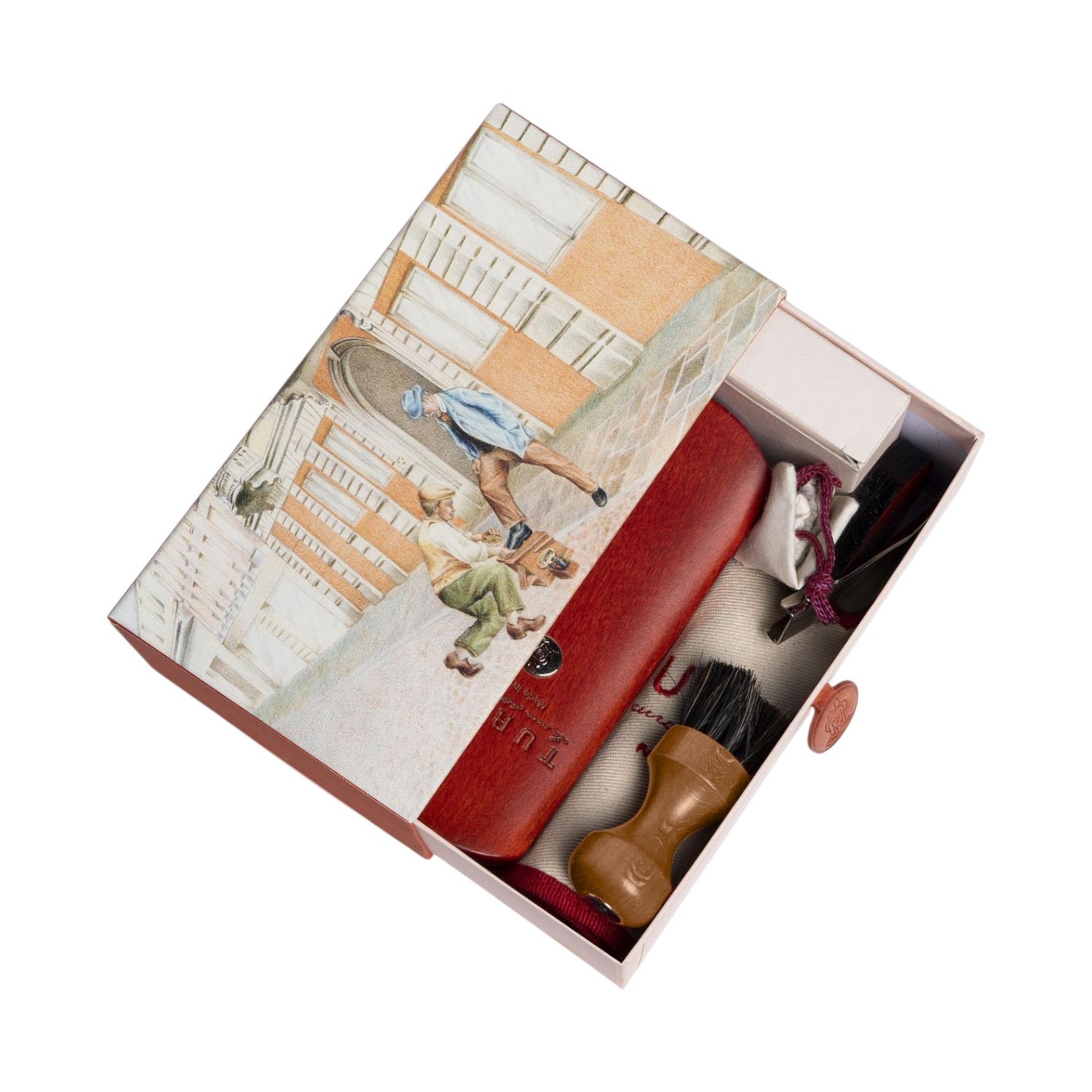 Turms Basic Calf Kit. The Basic Calf Kit contains 1 Foldable travel shoe horn, made of brass and real leather, hand-painted, 1 Polish wax Ml 75, available in aluminium tins with screw system, 1 Big Shoe brush, made of beech painted with waterbased colour and real horsehair bristles. 1 Cloth shoe shiner Pile and cotton for the final buffing and 1 polish brush round.