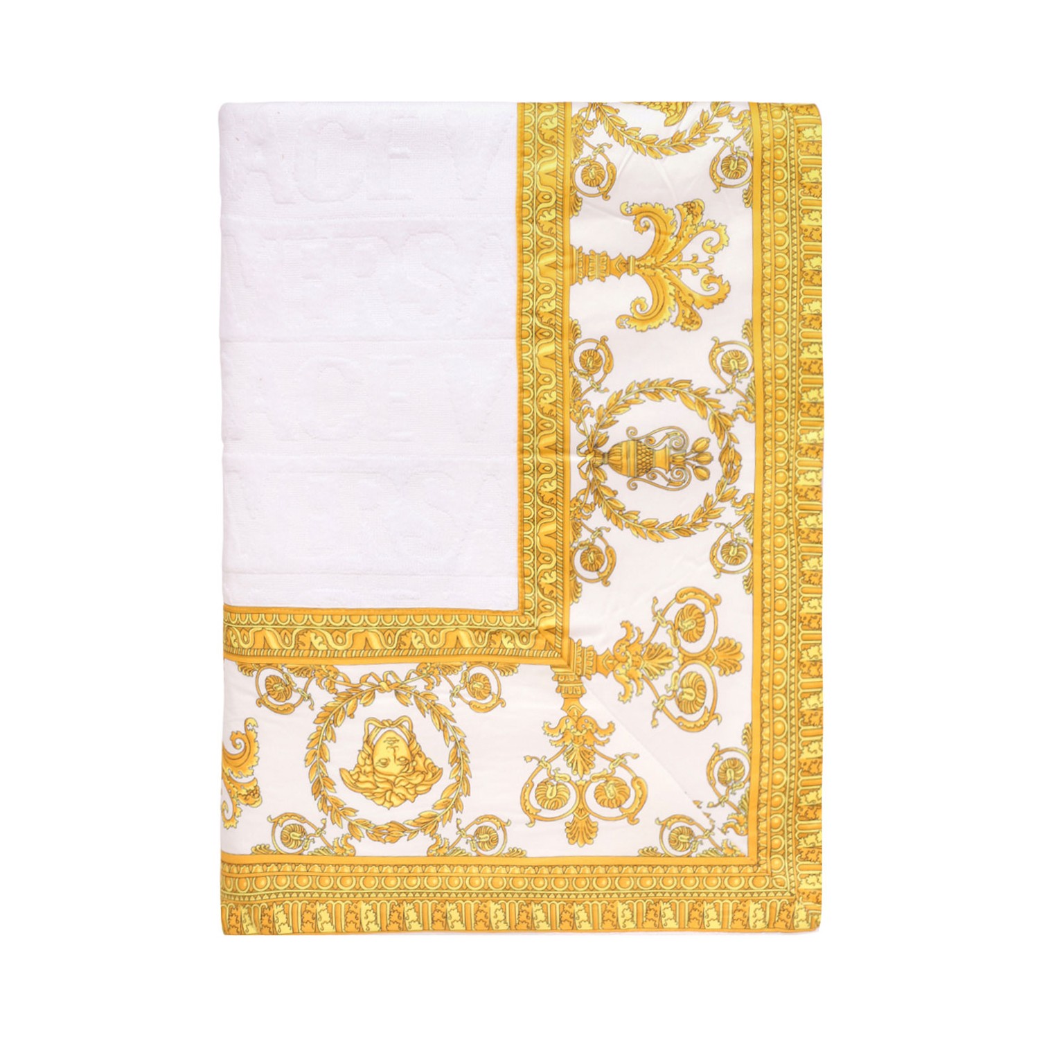 Versace Home White I Love Baroque Beach Towel. White beach towel in soft cotton terry with tone-on-tone Versace Allover motif and contrasting edges with I love Baroque print.