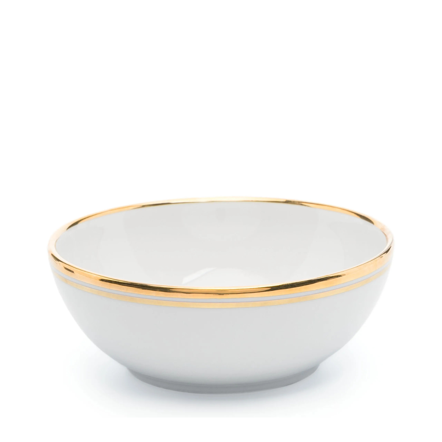 Ralph Lauren Home Ivory White Wilshire Bowl. Ivory white bowl with gold color, ceramic, matte finish, metallic effect, wheel design, contrasting edges and open top.