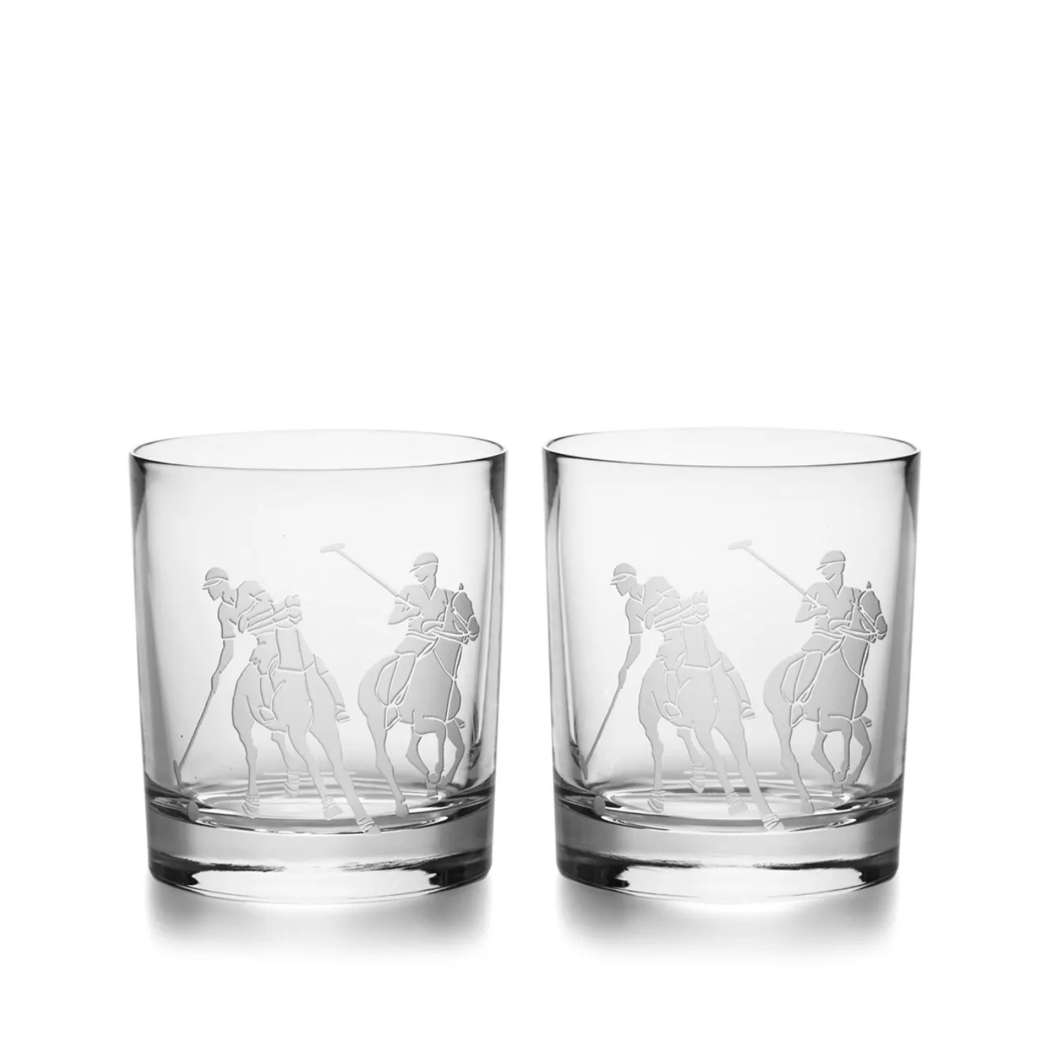 Ralph Lauren Home Set of 2 Garrett Double Old Fashioned Glasses. Crystal set of 2 Garret double old fashioned glasses with glossy effect, illustration style print and rounded corners.