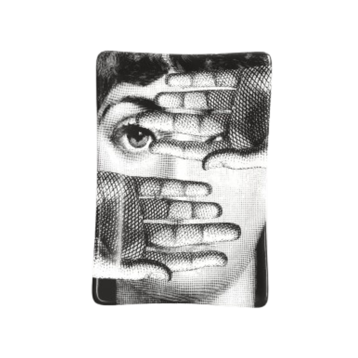 Fornasetti Rectangular Ashtray Theme and Variations No.154. This Fornasetti ashtray enriches the Tema e Variazioni series with a compositional game on the border between reality and imagination. Each rectangular Fornasetti ashtray can be used as a pocket emptier. Each Fornasetti ashtray is a unique piece silkscreened by hand on porcelain: any minimal discrepancies between similar creations are the result of artisanal production.