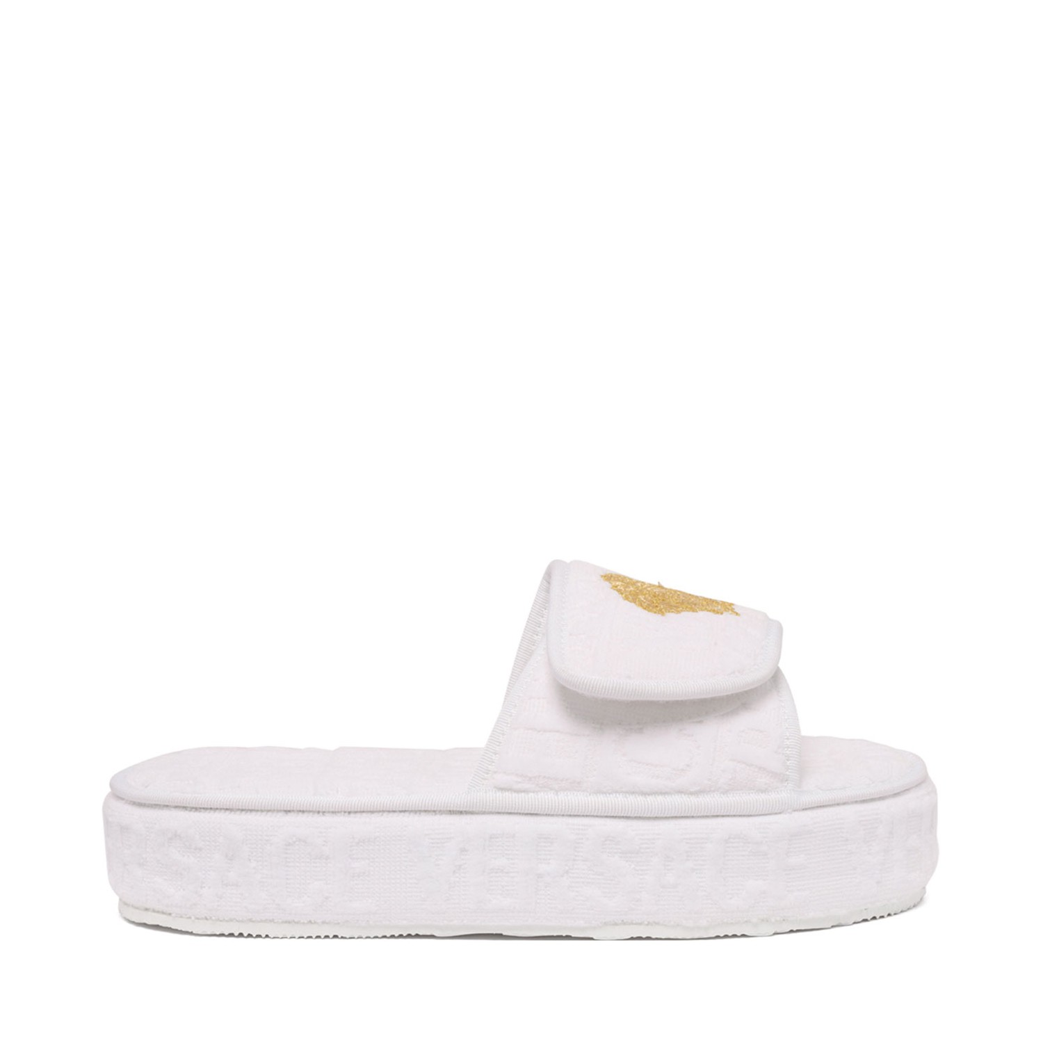Versace Home White Medusa Head Platform Slippers. White platform slippers with Medusa Head motif, all-over embossed logo print. Open toe, front touch-strap fastening and platform sole.