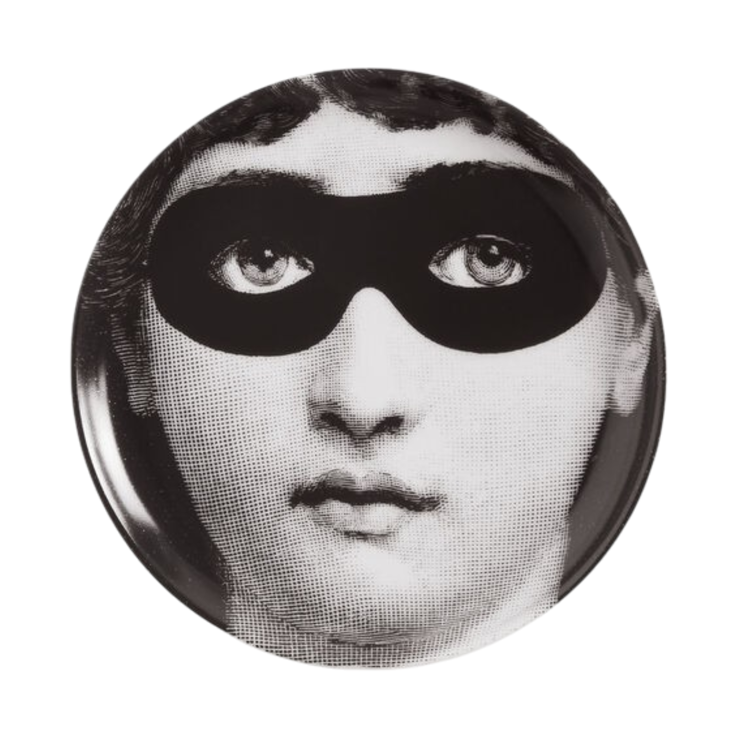 Fornasetti Coaster Theme and Variations n.22. The round shape of this coaster frames the features of Lina Cavalieri, in one of the countless interpretations that Fornasetti dedicated to her in the Tema e Variazioni series. Any minimal discrepancies between similar creations are the result of artisanal production and attest to the uniqueness of each product.