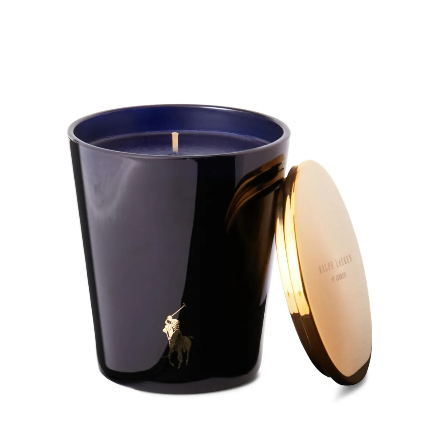 Ralph Lauren Home Pied a Terre Candle. Navy blue and gold-tone candle with soy wax, signature Polo Pony motif, single cotton wick, circular design, matching lid.