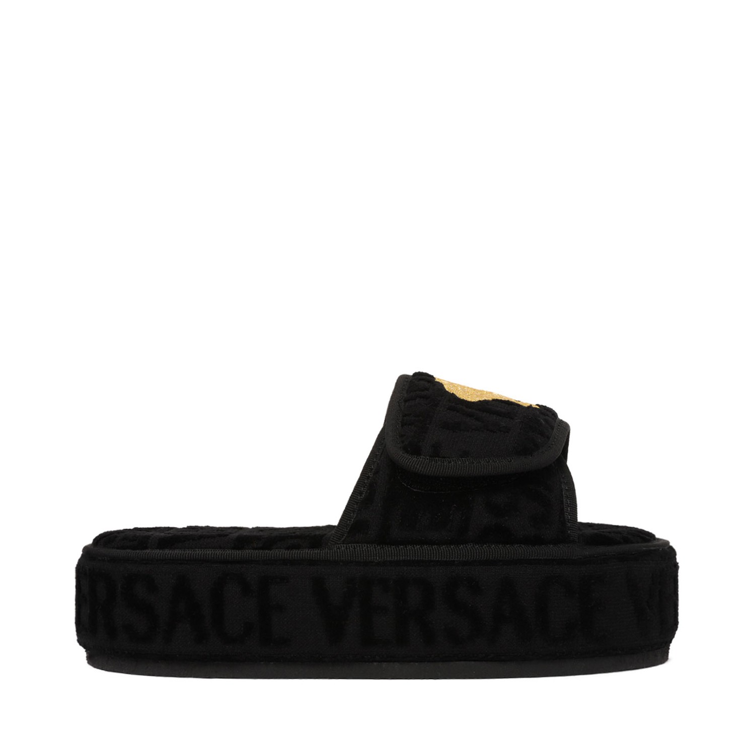 Versace Home Black I Heart Barroque Slippers. Crafted in black cotton, these slides feature the iconic Medusa head emblem, a symbol of power and glamour.