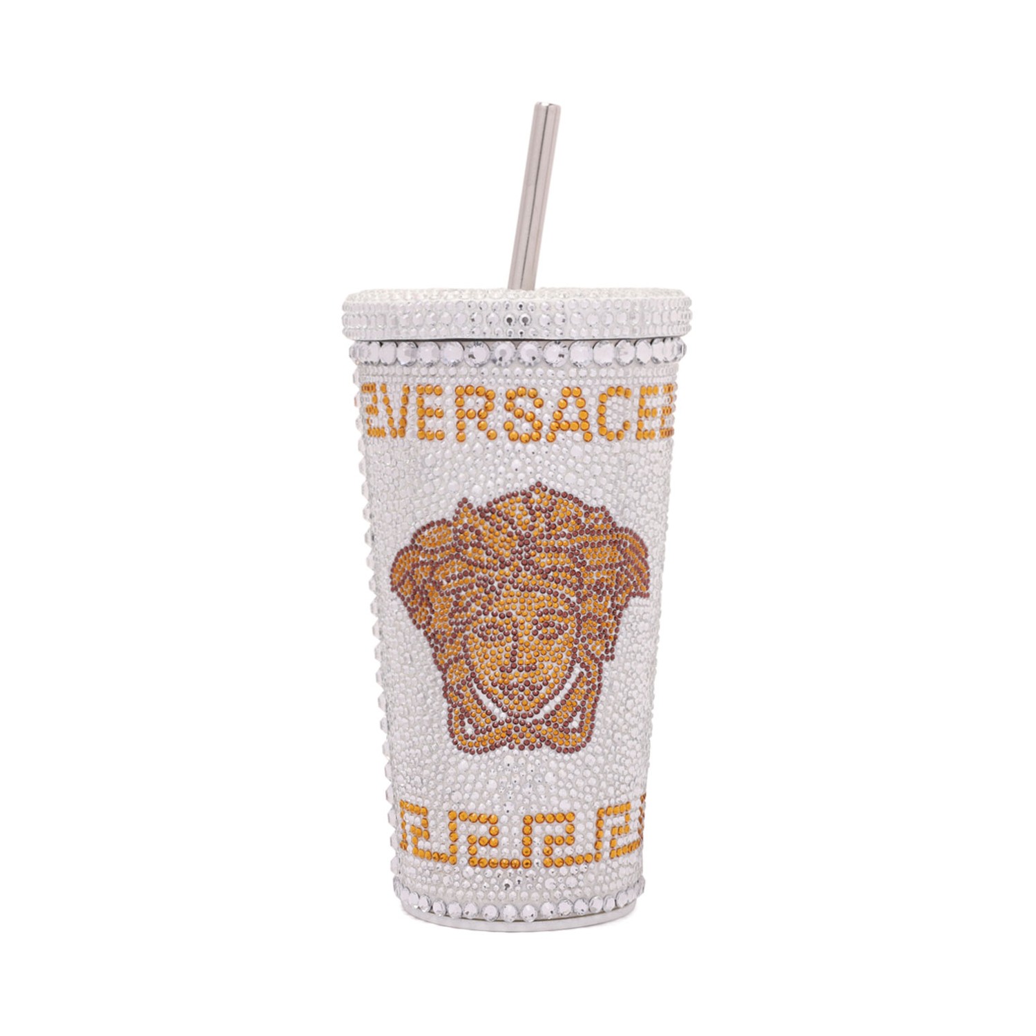 Versace Home White Travel Cup With Medusa Crystals. White stainless steel travel cup with crystals and straw for cold drinks with Medusa and Logo motifs.