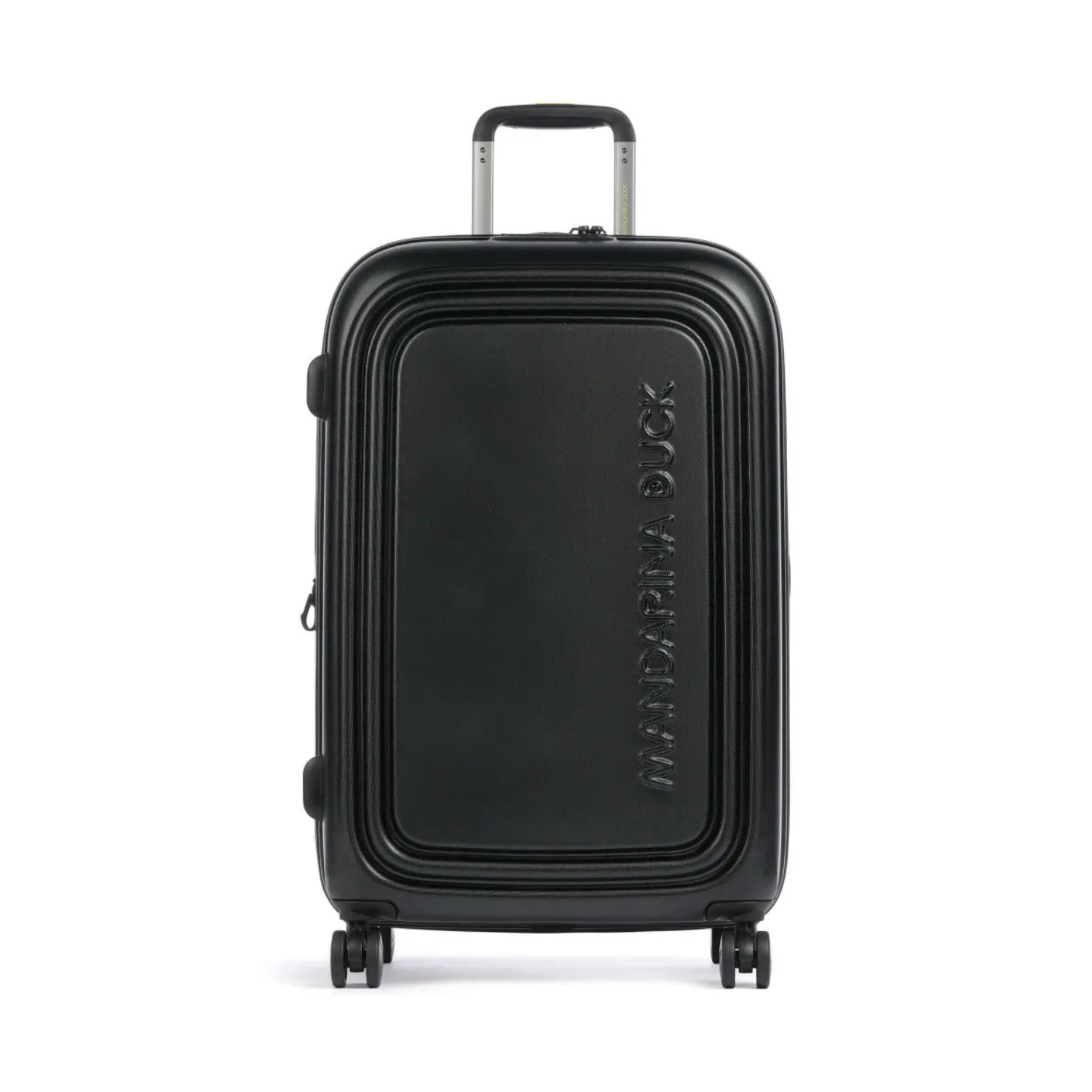 Mandarina Duck Black Logoduck Medium Expandable Trolley. Black soft, rounded shapes and a compact volume trolley with two rods, extractable and multi-step. Double interior compartment, 1 zip pocket, adjustable straps with buckle.