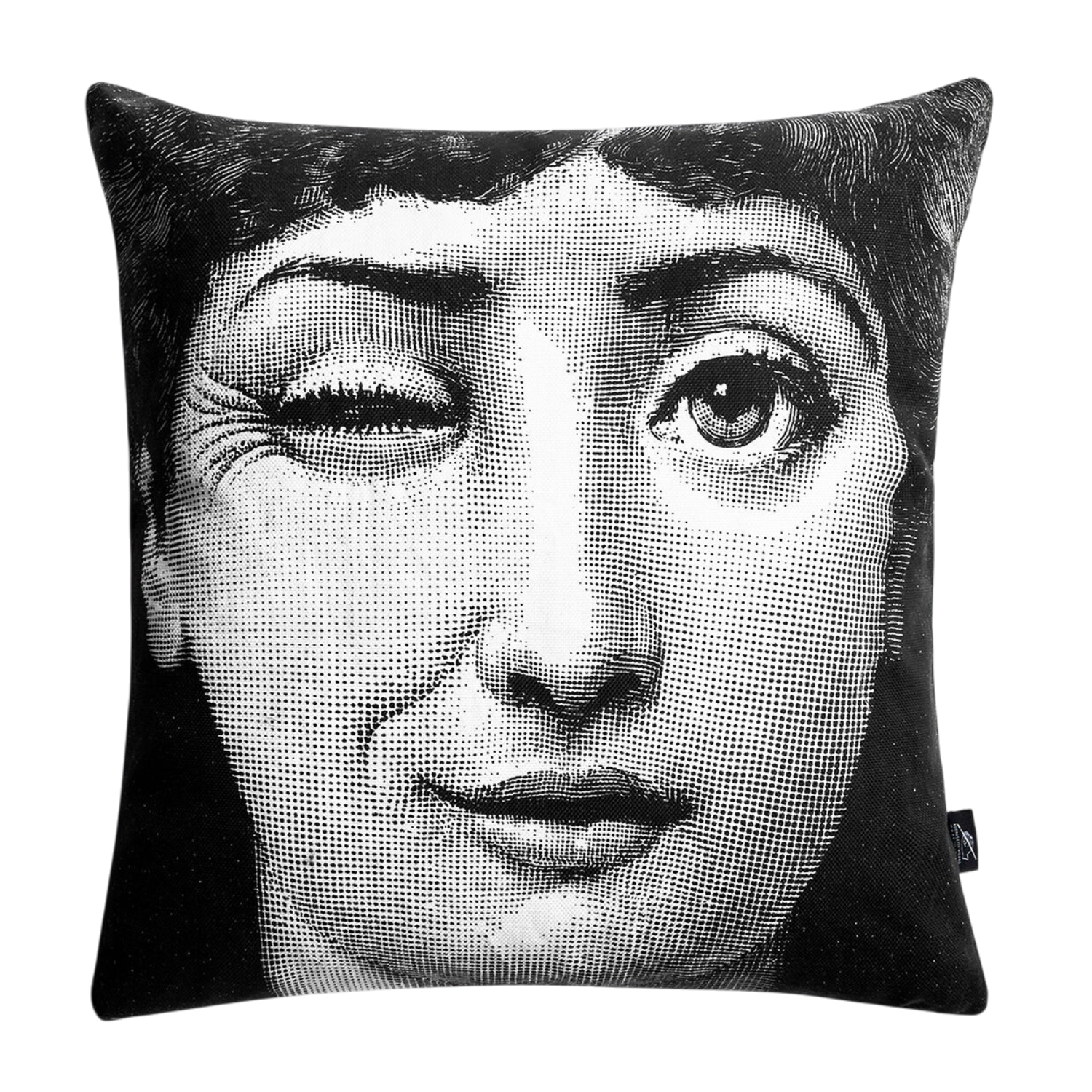 Fornasetti Cushion Tema e Variazioni n. 82-130. The face of opera singer Lina Cavalieri, reinterpreted by Piero Fornasetti, embellishes this cotton and linen cushion, belonging to the iconic Tema e Variazioni series: a true collector's item. Removable cover. Padding included. Any minor discrepancies between similar creations are the result of craftsmanship and attest to the uniqueness of each product.