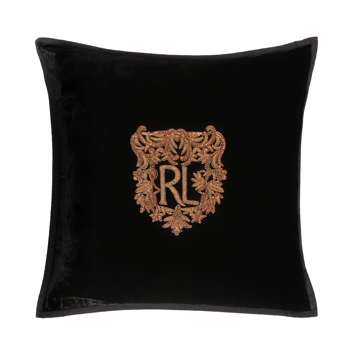 Ralph Lauren Home Black Decorative Cushion. Black decorative cushion defined by a refined, timeless aesthetic. Crafted from soft premium fabric with a smooth, velvety texture, this Ralph Lauren Home cushion features a structured square silhouette that adds elegance and depth to any interior setting. The rich black background is enhanced by a striking embroidered crest with the iconic