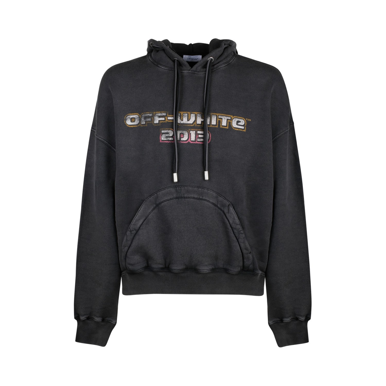 Off White Black and Multicolour Cotton Digit Bacchus Hoodie. Black and multicolour cotton hoodie, drawstring hood, logo print at the chest, graphic print to the rear, logo print to the rear, front pouch pocket, drop shoulder, long sleeves, ribbed cuffs and hem, straight hem.