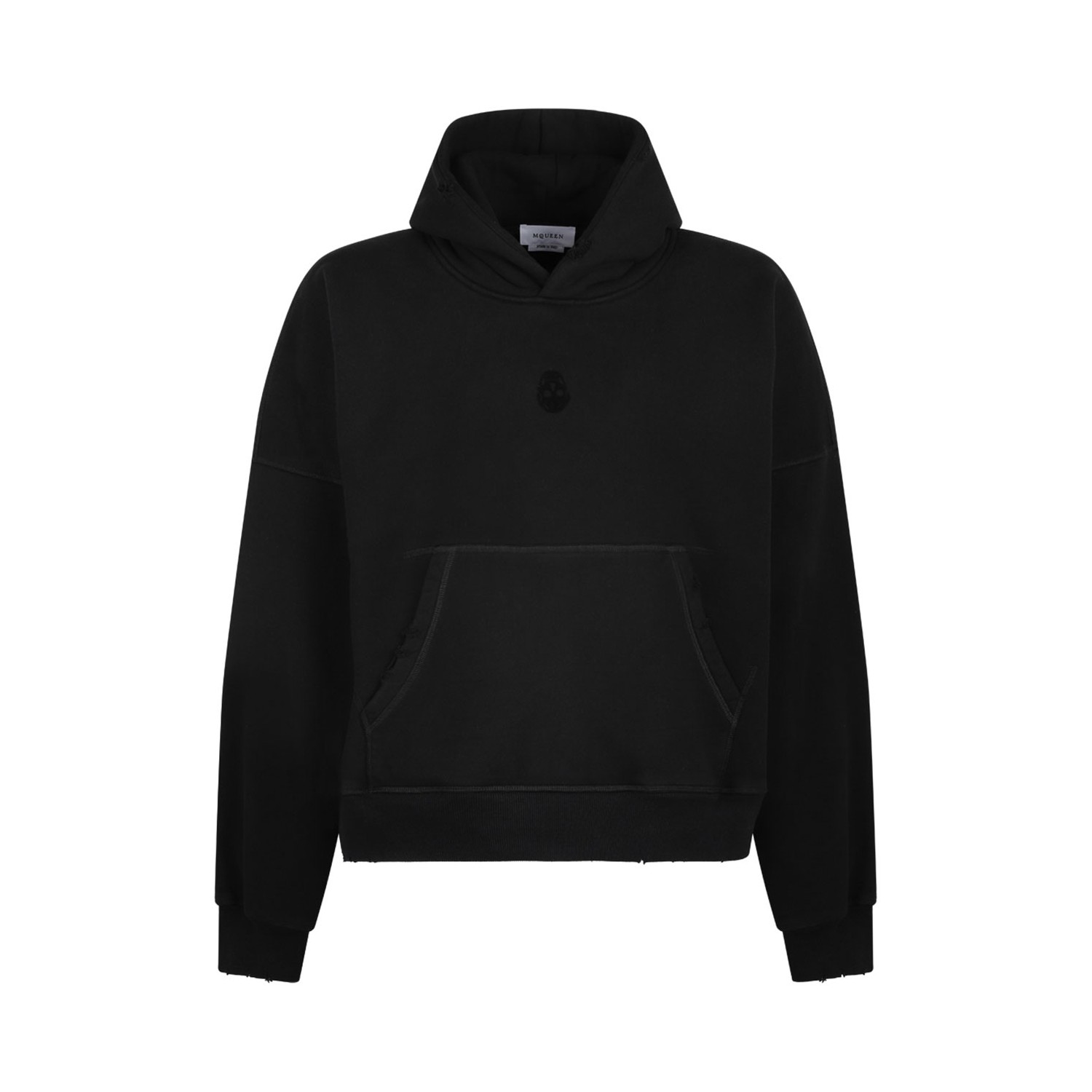 Alexander McQueen Black Selvedge Hoodie. Black cotton hoodie with front pouch pocket, fixed hood, ribbed cuffs. Raw-edge hem and tonal logo embroidery.