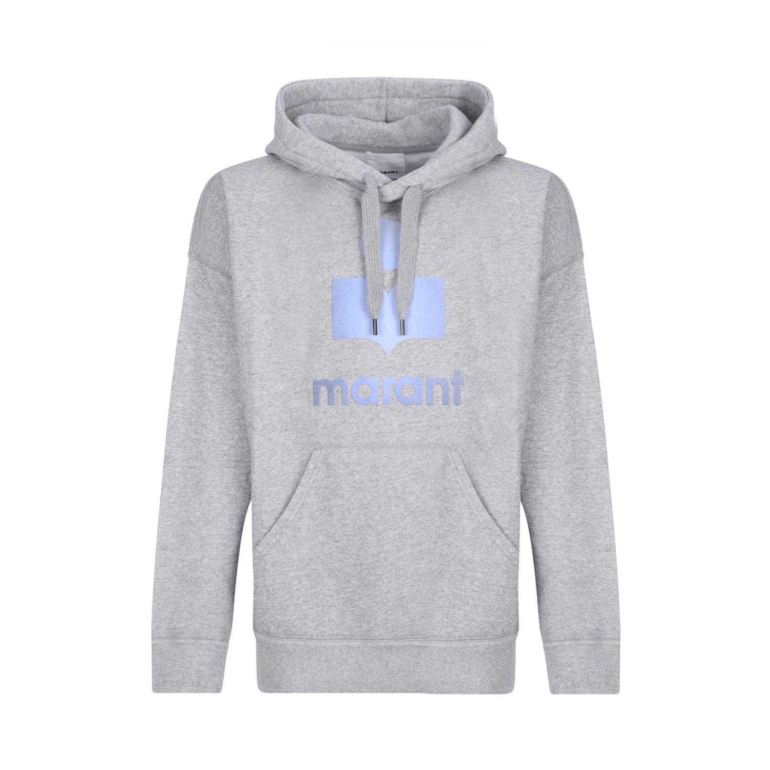 Marant Heather Grey Miley Hoodie. Heather grey cotton blend hoodie with logo print to the front, drawstring hood, drop shoulder, long sleeves. Slouch body, front pouch pocket, ribbed cuffs and hem.