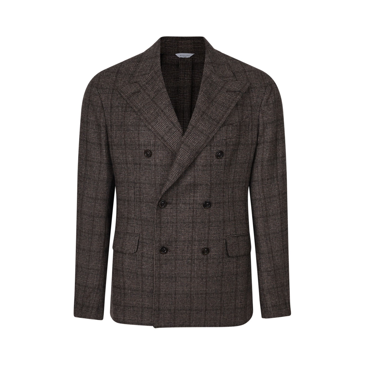 Boglioli Brown Tartan Double Breasted Jacket. Brown double brested jacket with classic collar, front button fastening, front pockets, long sleeves.