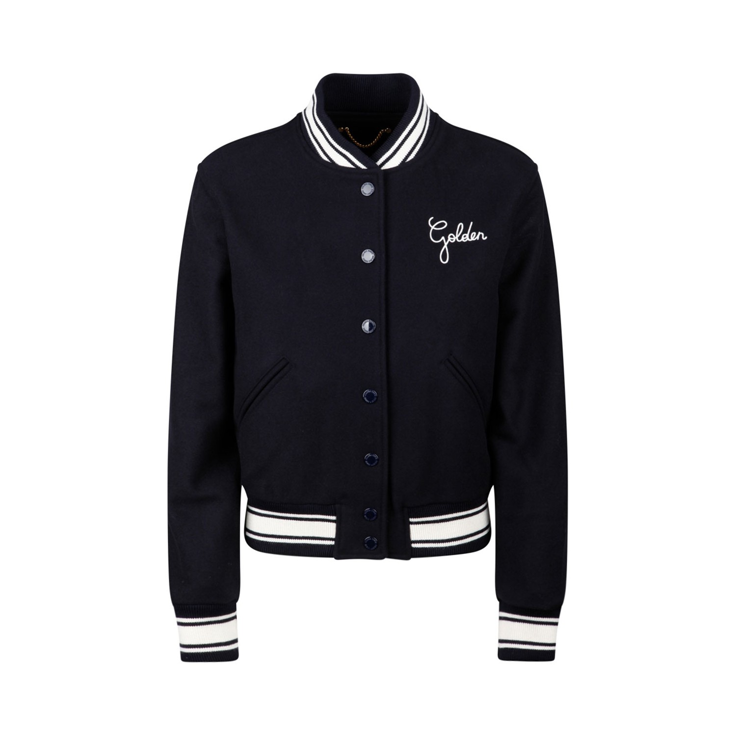 Golden Goose Dark Blue Bomber Jacket. Dark blue wool bomber jacket, contrasting white logo and details. Double gold star on the back, two front pockets, long sleeves, button closure.