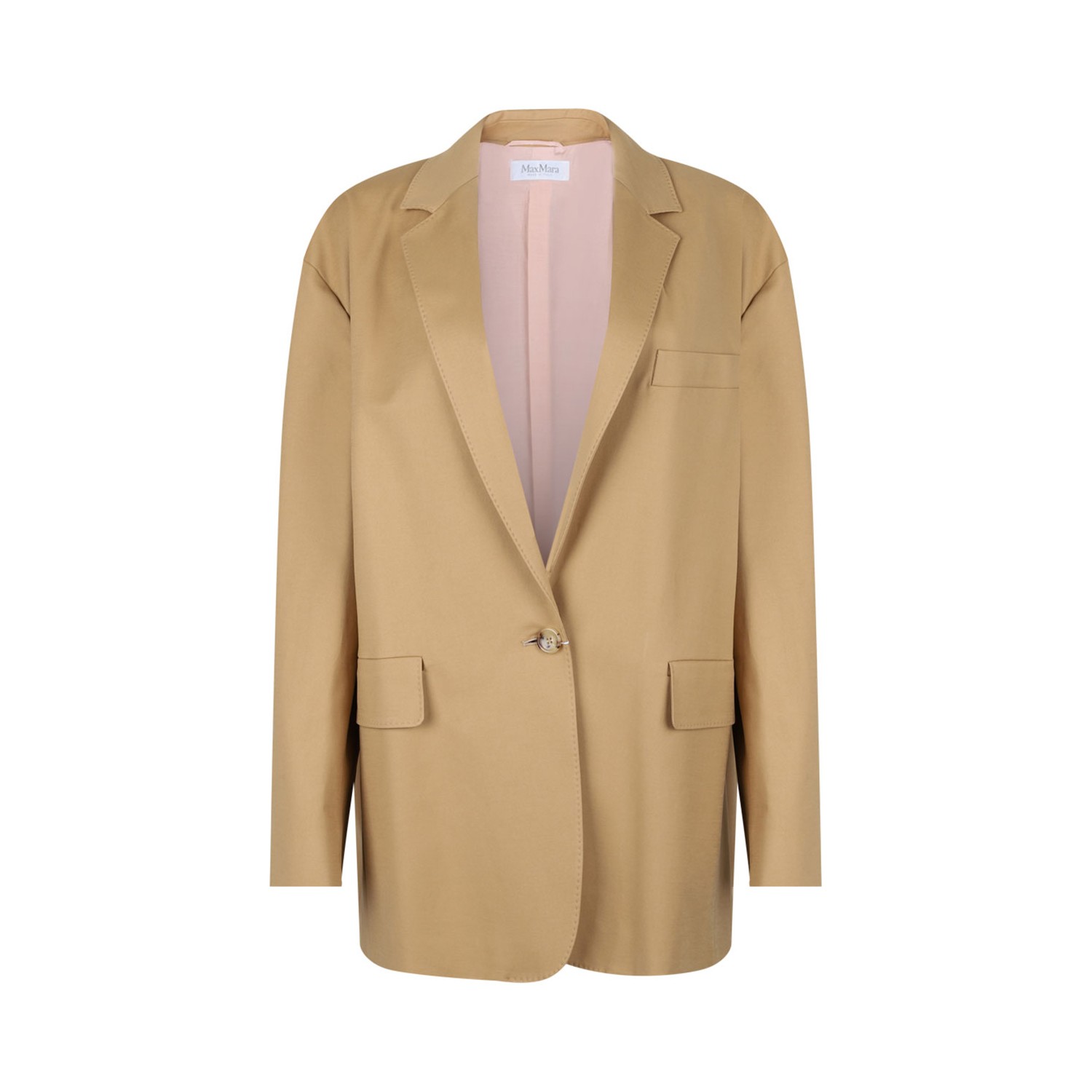 Max Mara Monica Light Beige Jacket. Single-breasted blazer with an oversized volume, made of double stretch cotton canvas. Men's inspired model characterized by lapel collar, chest pocket and welt pockets with flap on the front. Central vent on the back and long dropped shoulder sleeves with buttons on the cuffs. Lined, it is finished with internal piping and front closure with a single visible button.