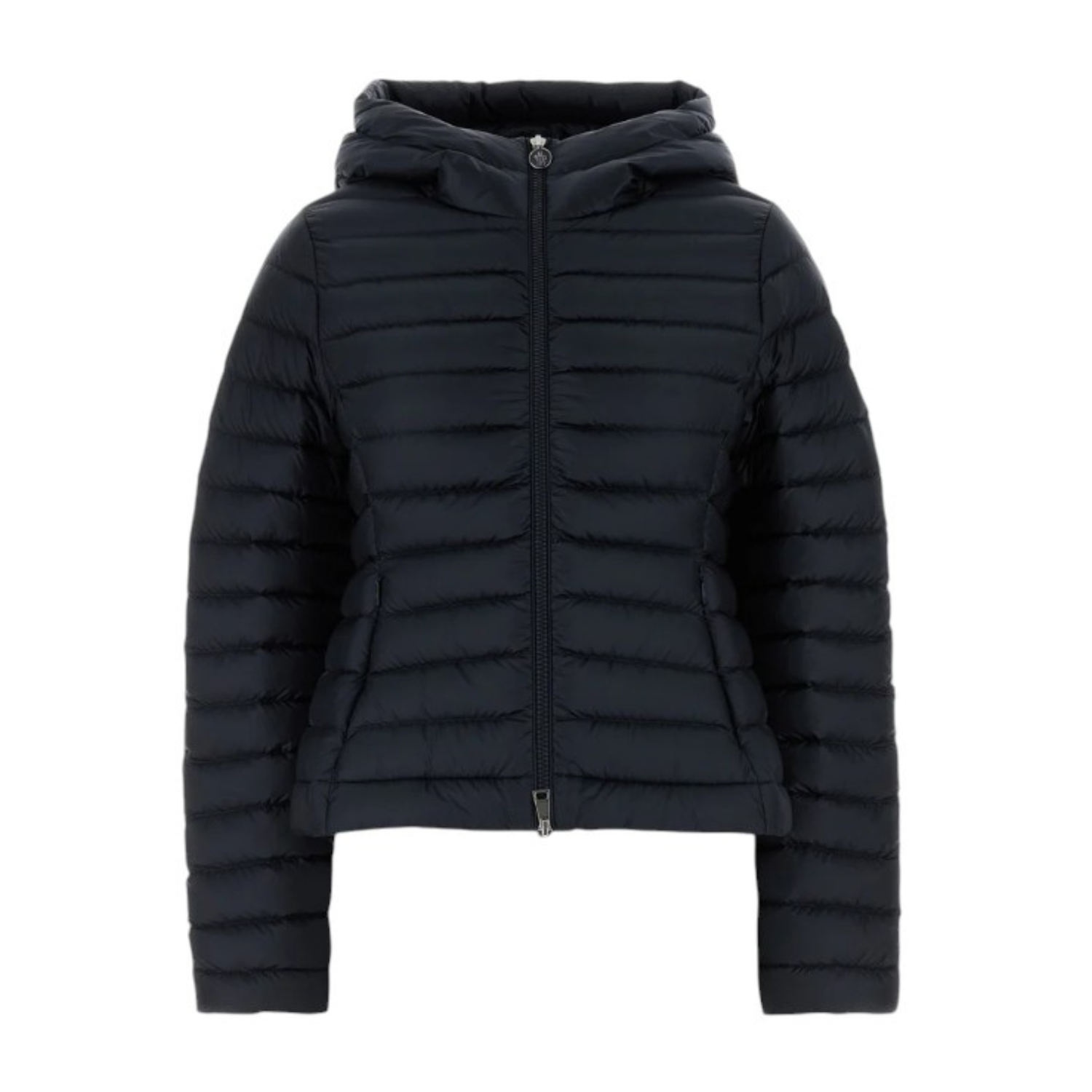 Moncler Navy Blue Down Jacket. Navy blue down jacket made of quilted nylon enriched by a contrasting logo application on the sleeve. Hood, zip closure, two zip pockets on the front, lined.