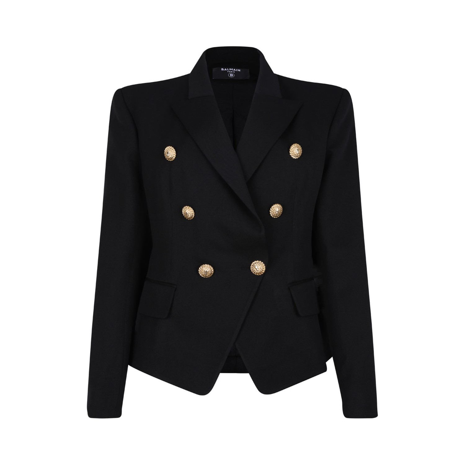 Balmain Black Fitted Wool 6-Button Jacket. Black 6-button wool jacket with Italian tailored collar, structured shoulders, long sleeves. Straight cuffs with 5 buttons, double-breasted fastening, 6 buttons on the front, 5 of which are decorative. "Double Chain Lion" buttons in gold metal, 2 side slash pockets with flaps, slash inside pocket with button, twill lining.