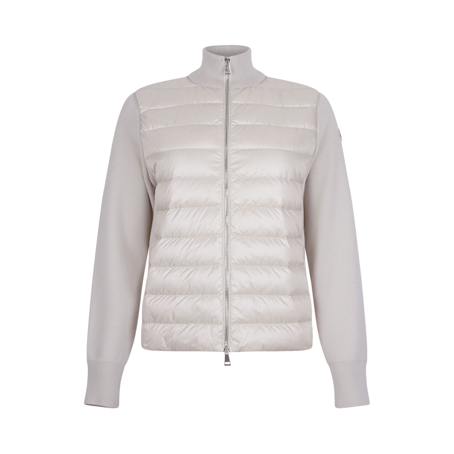 Moncler White Cardigan Jacket With Zip. White padded nylon cardigan with wool sleeves, logo patch on the sleeve, double zip front closure. Two side zip pockets, high collar and ribbed hem and cuffs.
