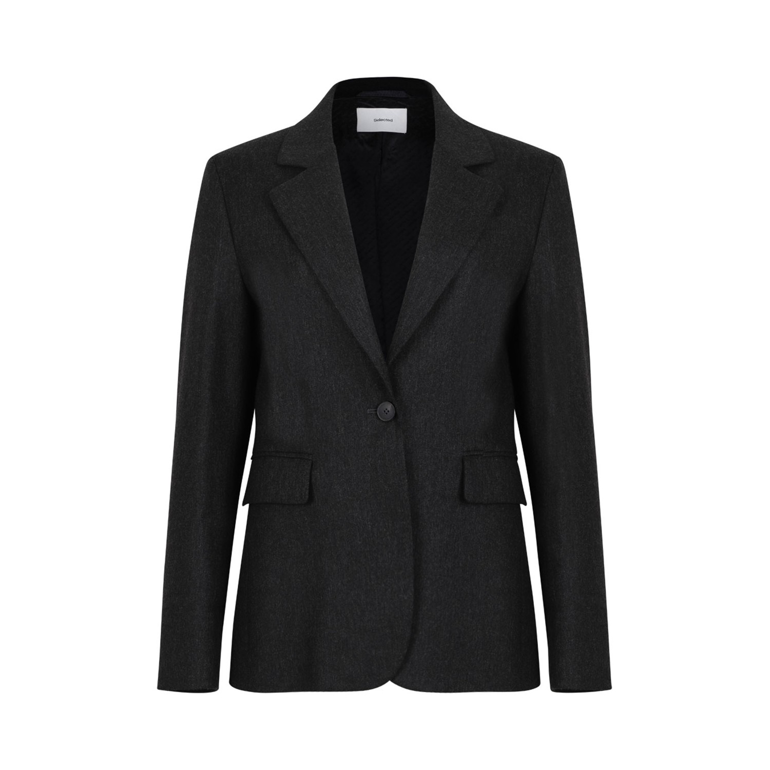 Douuod Dark Grey Suit. Dark grey suit with front button jacket, two pockets, long trousers with front fastening.