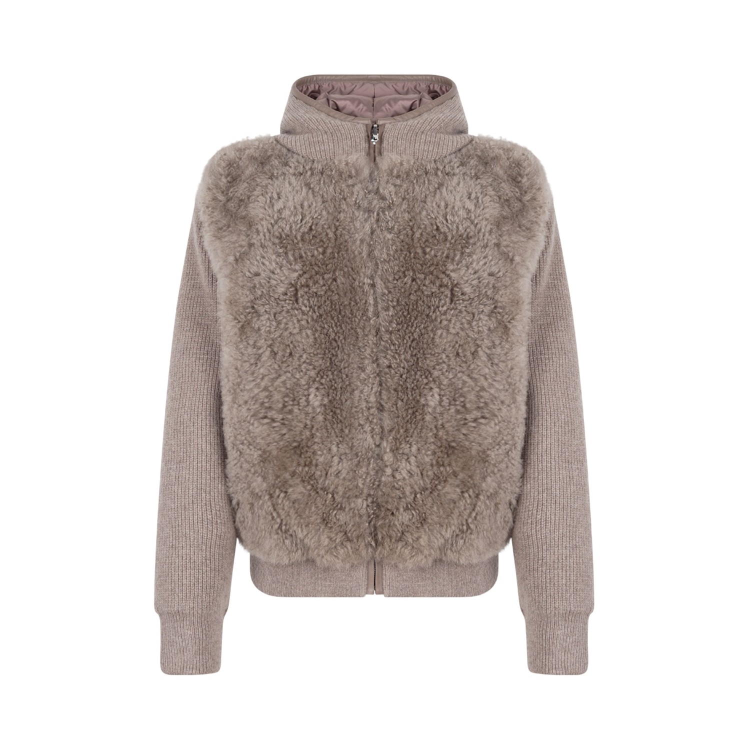 Antonio Arnesano Beige Shearling and Knit Double Face Jacket. Beige jacket with soft shearling front panels and knitted sleeves and back. Hood with full zip closure. Long sleeves with ribbed cuffs, ribbed hemline for a structured fit. Casual yet refined outerwear piece with a cozy texture contrast. Double face with padded side.