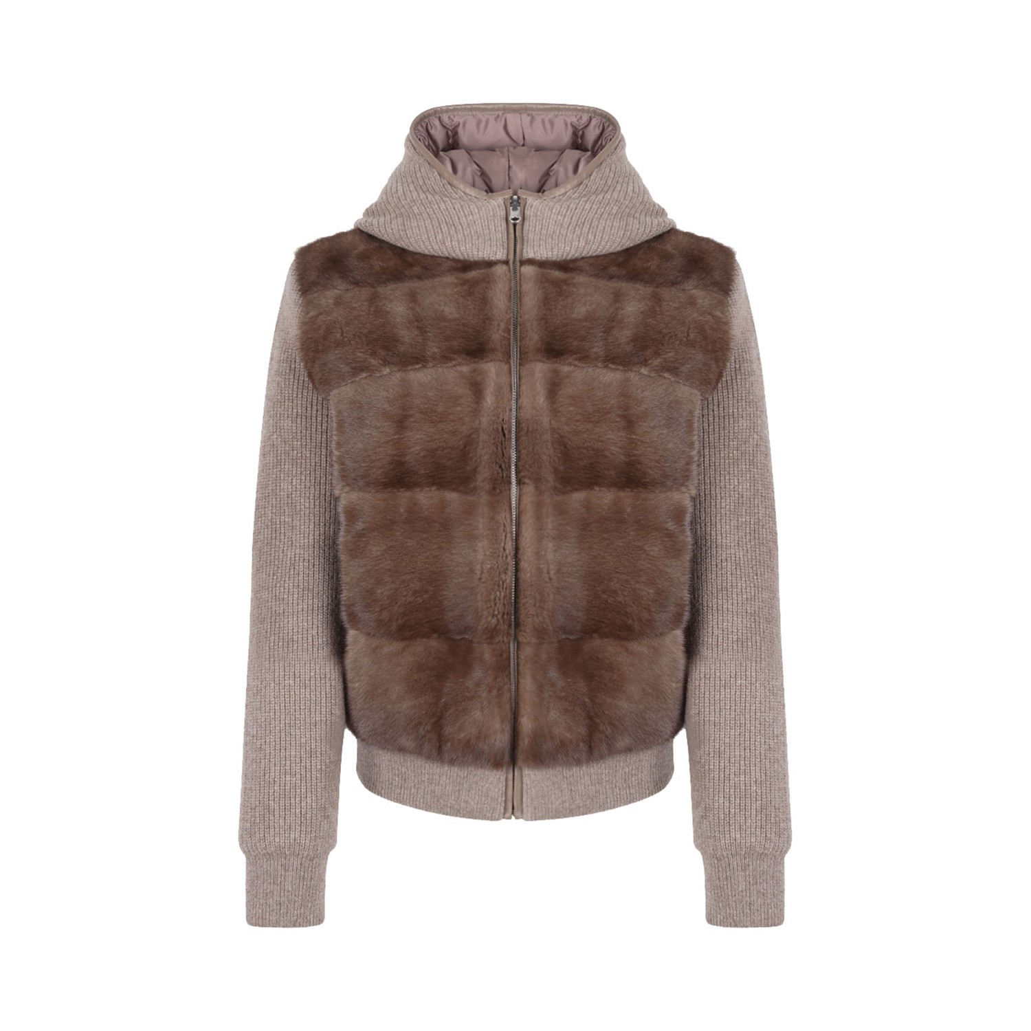 Antonio Arnesano Beige and Brown Shearling and Knit Double Face Jacket. Beige and brown jacket with soft shearling front panels and knitted sleeves and back. Hood with full zip closure. Long sleeves with ribbed cuffs, ribbed hemline for a structured fit. Casual yet refined outerwear piece with a cozy texture contrast. Double face with padded side.