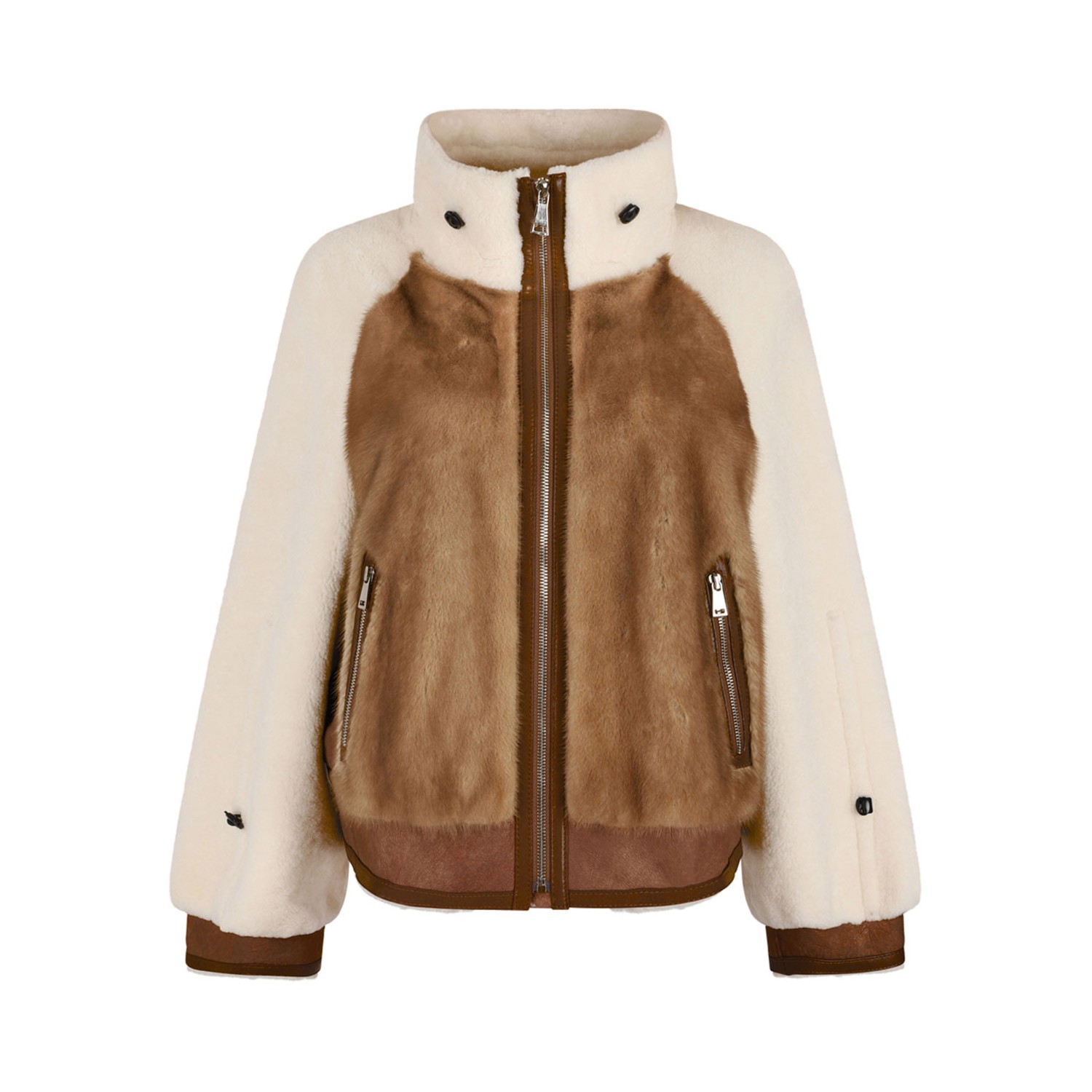Antonio Arnesano Beige Shearling Sheepskin Jacket with High Collar. Luxurious beige shearling sheepskin jacket by Antonio Arnesano, crafted for exceptional warmth, comfort, and timeless style. This refined piece features a high collar for added elegance and protection, long sleeves for a classic silhouette, and a front zip closure for a sleek, secure fit. Two front zip pockets provide both functionality and style, while the soft, plush shearling interior offers unparalleled coziness. The neutral beige hue adds a sophisticated and versatile touch, making this jacket perfect for elevating everyday outfits or creating a chic statement in cooler weather. A seamless blend of traditional craftsmanship and contemporary luxury.
