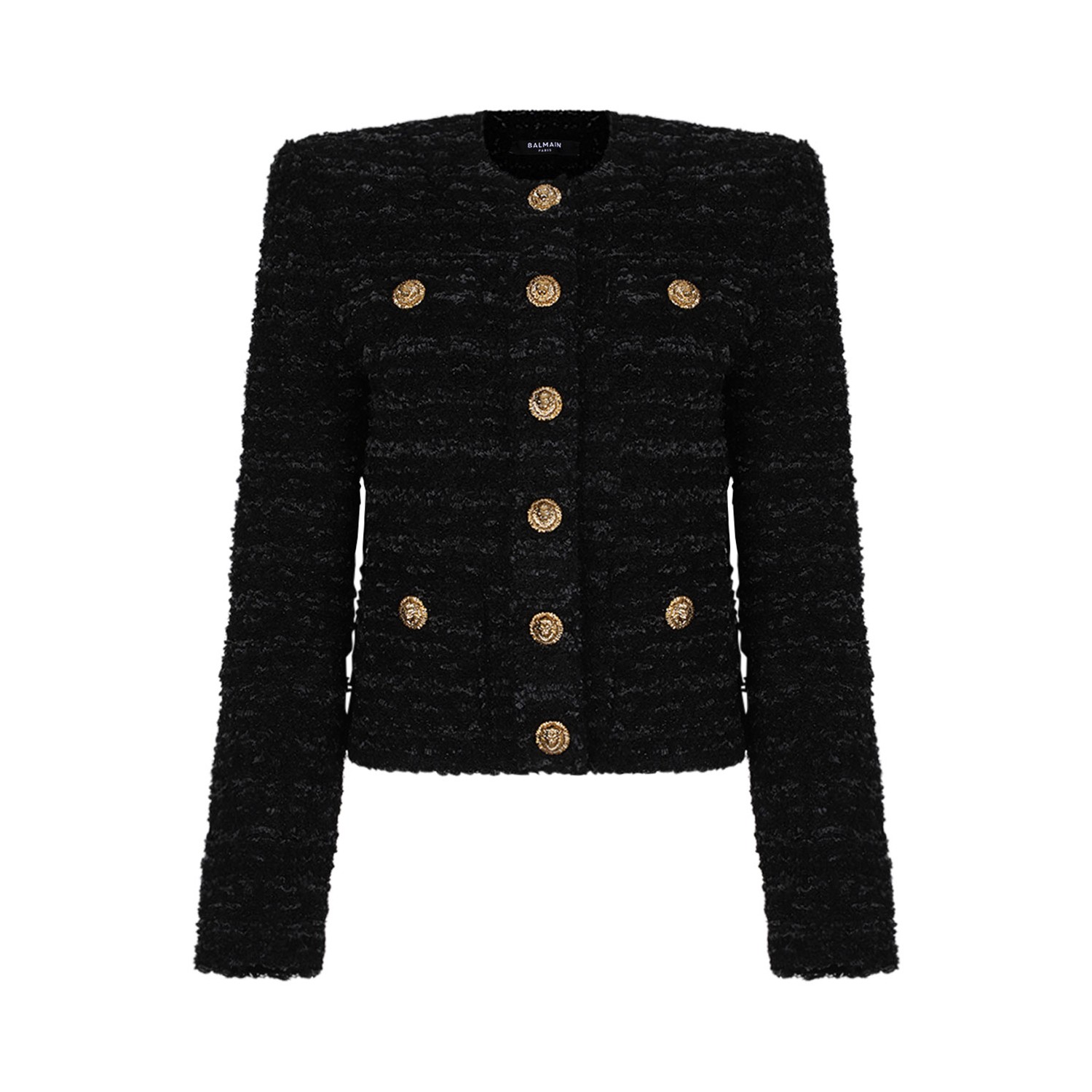 Balmain Black Tweed Jacket. Black tweed jacket with front button fastening and shoulder pads.