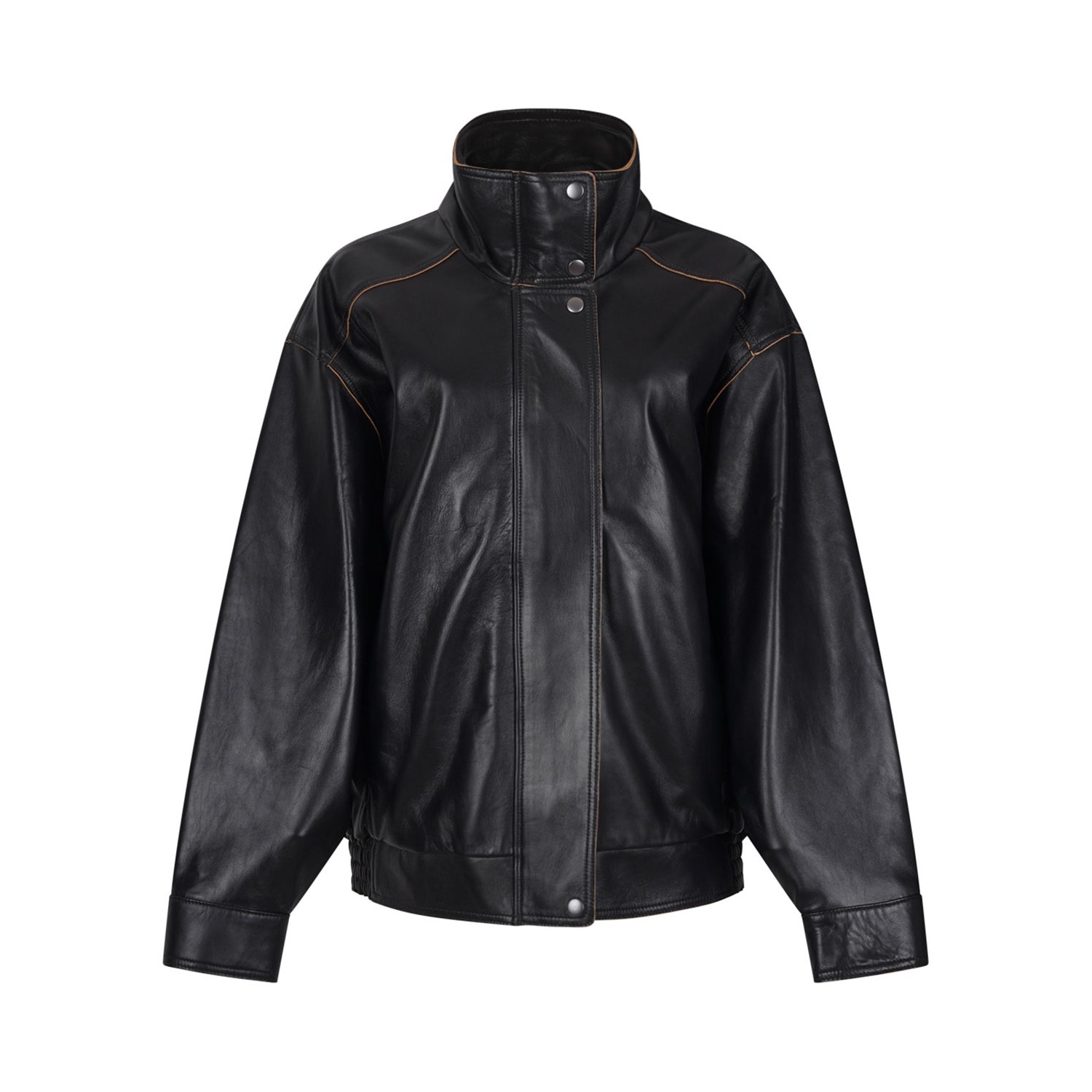 Calvin Klein Black Relaxed Fit Patent Leather Jacket. Black patent leather jacket with contrasting color tape on sleeves, shoulders, and neckline. Mandarin collar with snap button, hidden placket with exposed top and bottom buttons. Side welt pockets, snap buttons on cuffs, Calvin Klein logo label at back of neck.