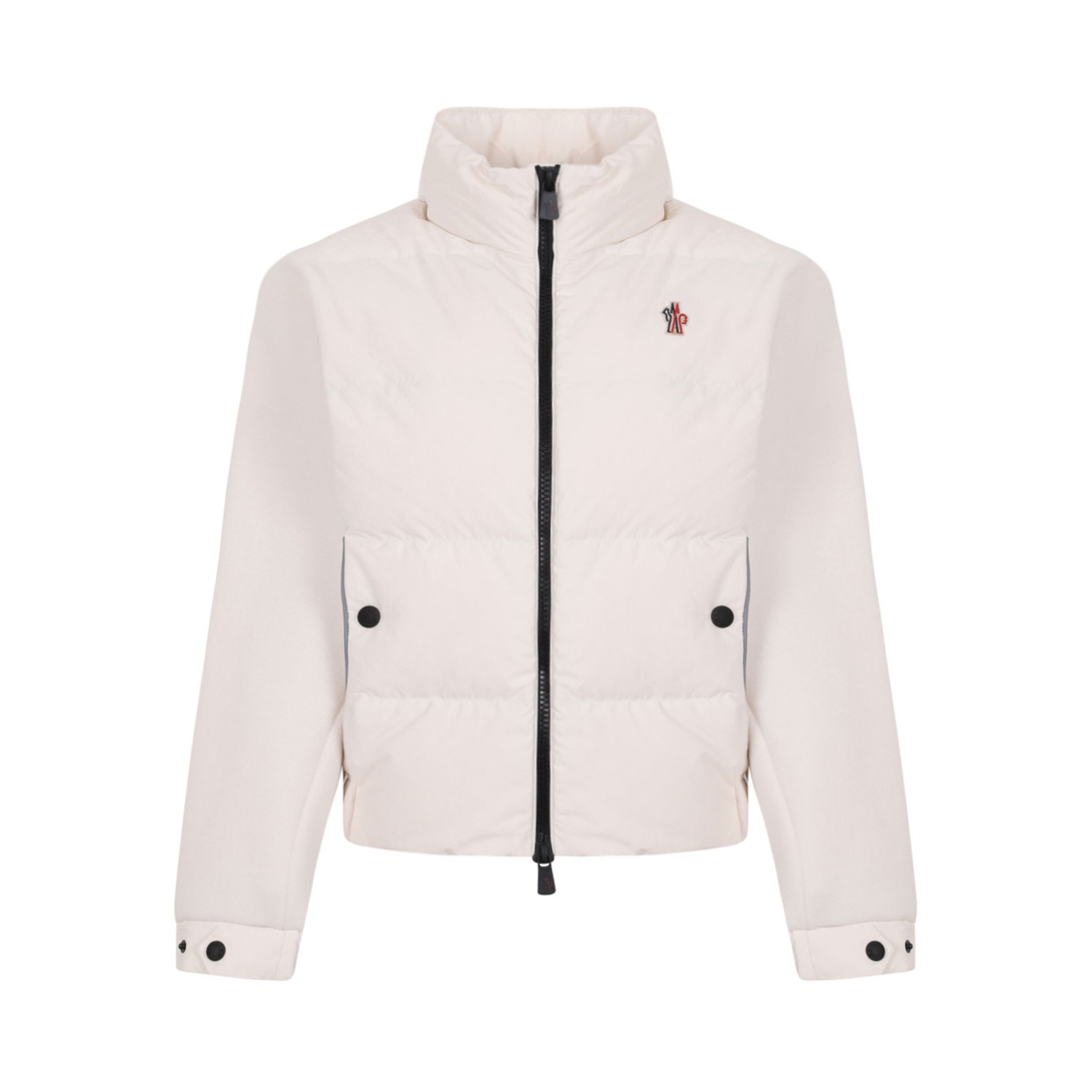 Moncler Grenoble White Padded Cardigan. White padded cardigan in technical fabric with front zip closure, high collar, two front pockets, logo patch to the front.