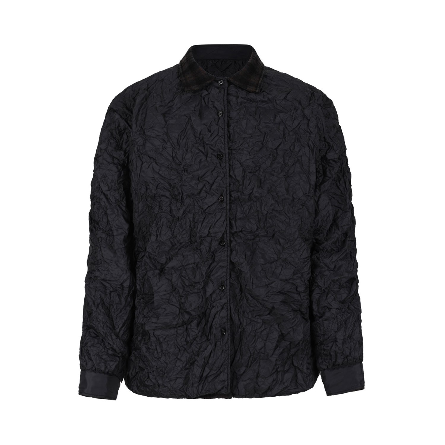 Maison Margiela Anthracite And Brown Quilted Jacket. This reversible, padded shirt jacket is constructed with quilted panels that crease the surface. The checked wool collar recalls rural archetypes, while the padding provides warmth and shape. The back features the signature four-stitch stitching , a Maison Margiela trademark: the opposite of a label.