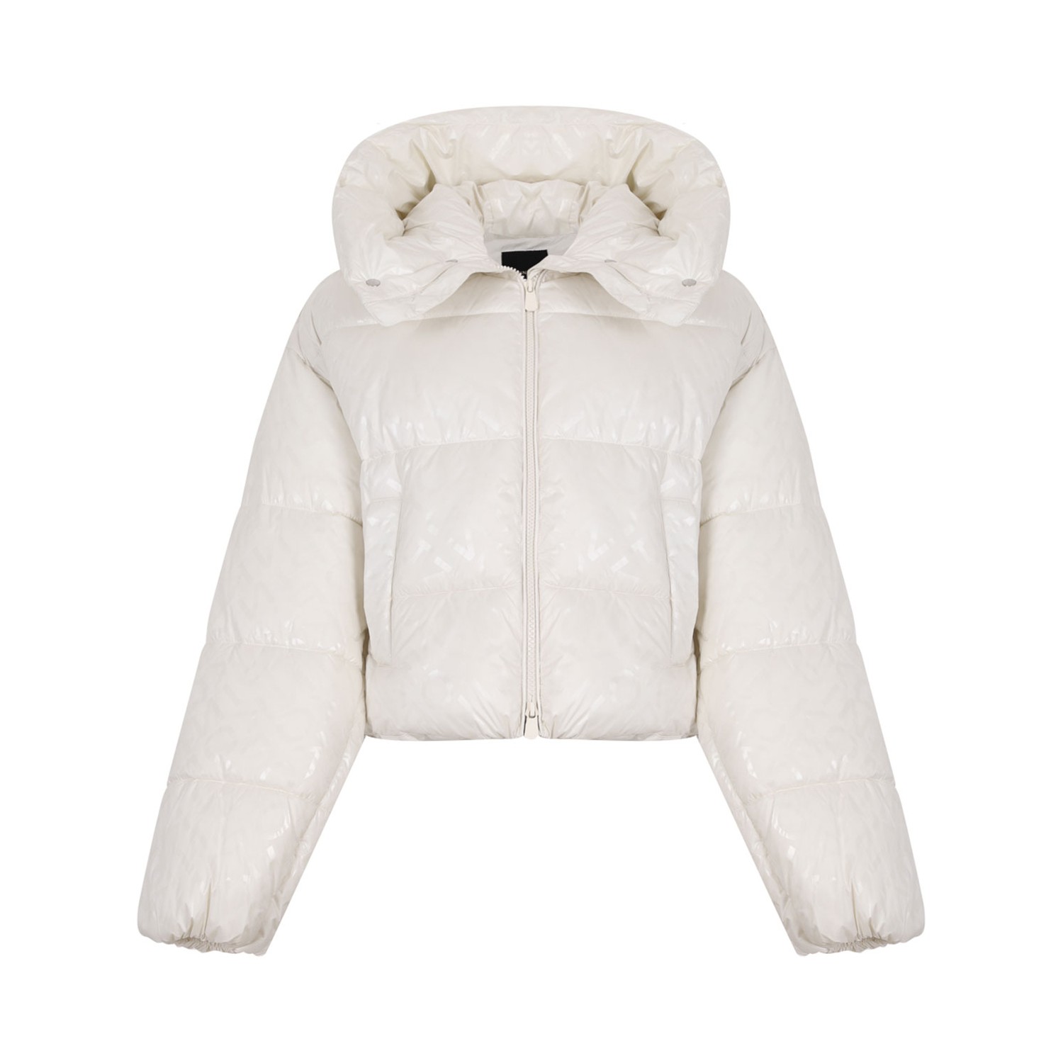 Pinko Off White Hooded Puffer Jacket. Off white hooded puffer jacket with quilted design, high neck, zip fastening, cropped.