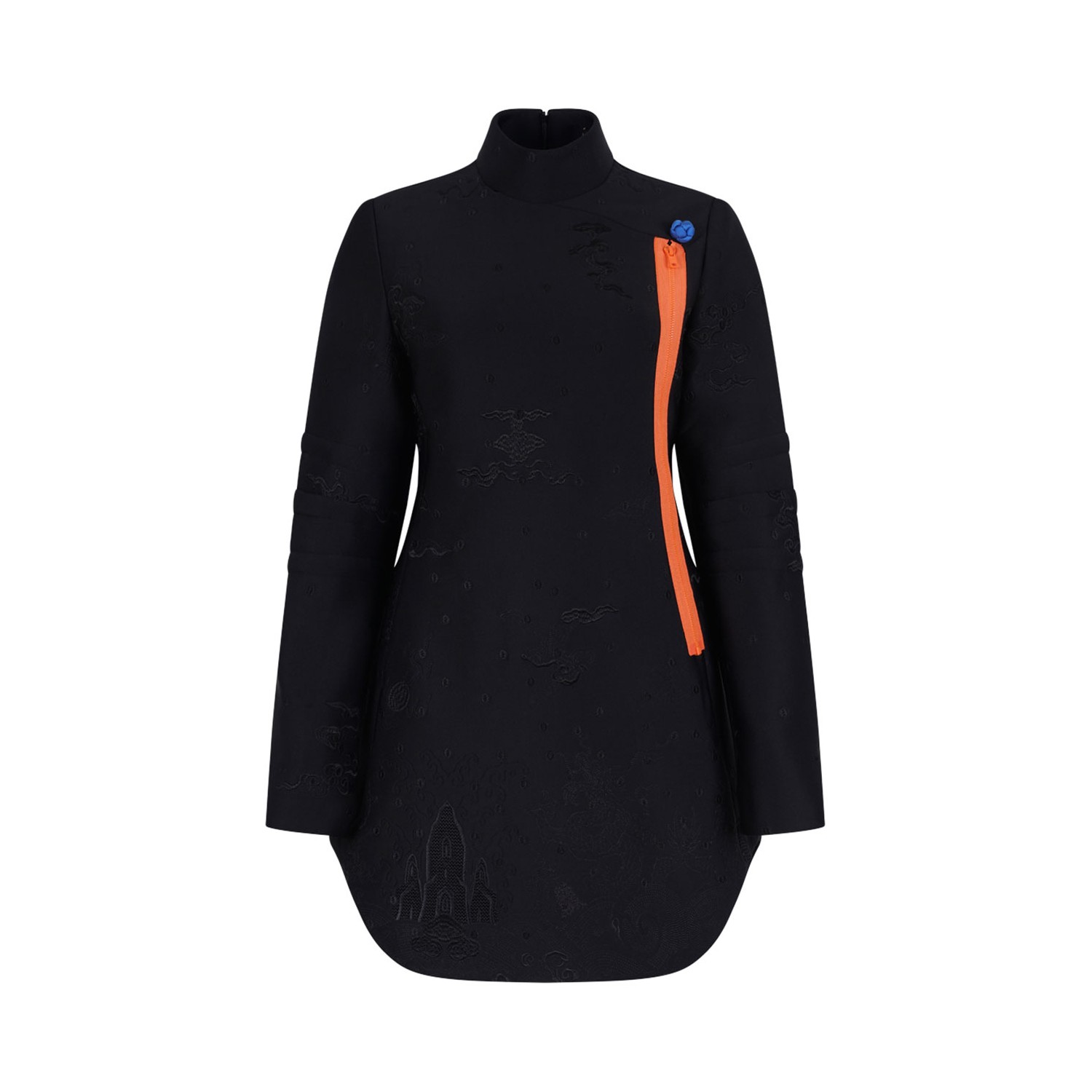 Hui Milano Dark Blue Chinese Jacket With Details. Refined dark blue jacket with a high neck inspired by traditional Chinese style. The embossed workmanship creates subtle patterns on the surface, adding texture and an artistic touch.