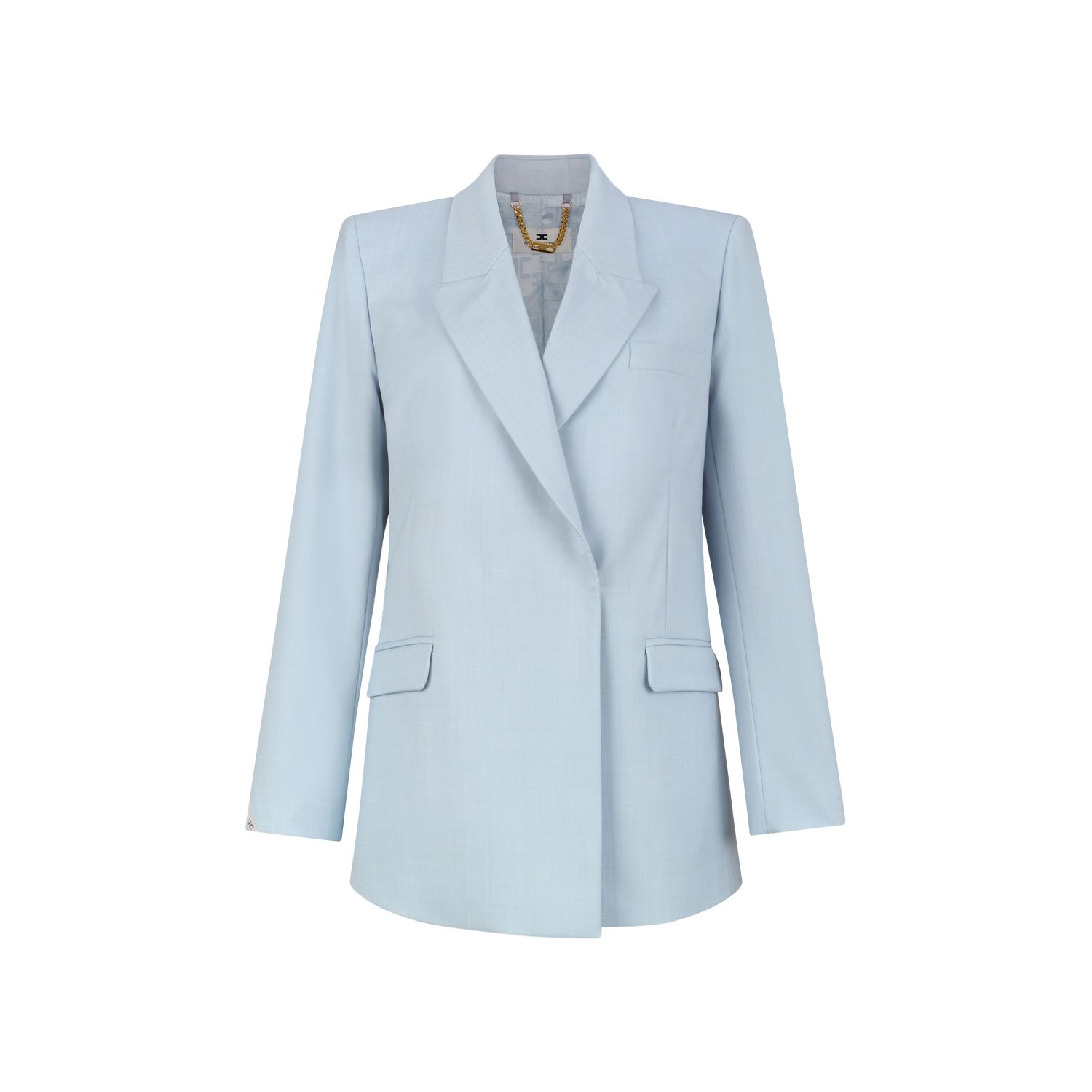 Elisabetta Franchi Light Blue Suit With Belt. his suit combines sartorial elegance and modernity with an impeccable design and meticulous detailing. The structured yet soft jacket features wide classic lapels and a tone-on-tone belt that accentuates the silhouette, creating a refined waistline. Flap pockets and a straight cut add a formal touch, balanced by the fluidity of the fabric and the relaxed fit. Palazzo trousers complete the look with a wide, slightly oversized silhouette, featuring a rolled hem that adds movement and lift to the figure.