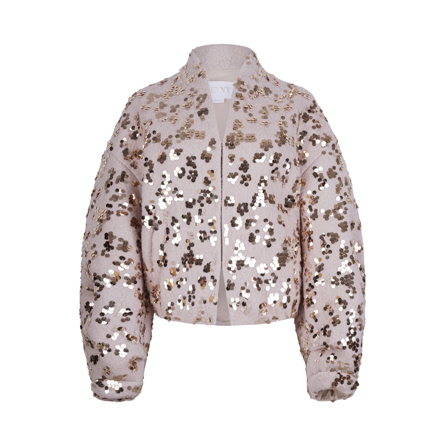 Genny Sequined Bomber Jacket With Wide Sleeves. An iconic piece with a sculptural allure: this boucle bomber jacket stands out for its voluminous puff sleeves and sophisticated gold sequin embroidery. The concealed hook-and-eye closure and welt pockets lend a discreet elegance, while the relaxed fit gracefully accompanies every movement. The back neckline is complemented by a three-dimensional plaque recreating the Maison's iconic orchid. A perfect balance of comfort and sparkle, designed for those who want to stand out with sophistication.